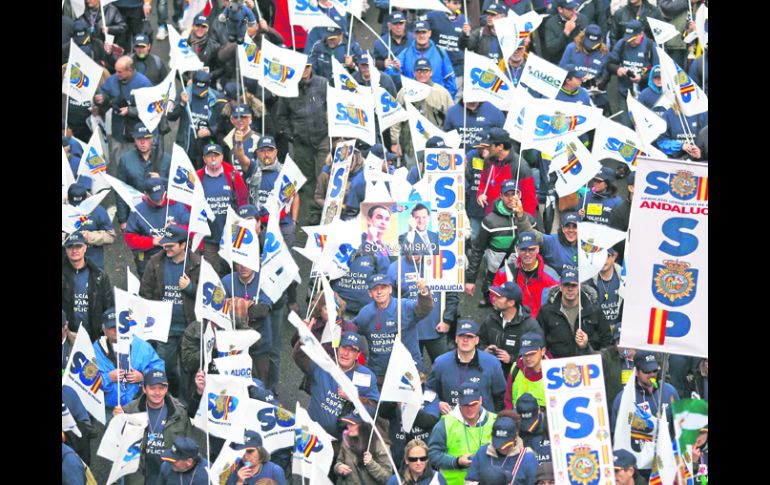 Internacional | España. Manifestación en Madrid Policías protestan contra recortes Cinco mil policías procedentes de toda España se manifestaron en Madrid para denunciar las reducciones de salarios y de personal en la policía Por: AP 18 de noviembre de 2012 - 00:45 hs Madrid. Unos cinco mil policías salieron a las calles de la capital ibérica. REUTERS / MADRID, ESPAÑA (18/NOV/2012).- Alrededor de cinco mil policías procedentes de toda España se manifestaron en Madrid para denunciar las reducciones de salarios y de personal en la policía, tres días después de la huelga general contra la austeridad. “Ciudadanos, os pedimos perdón por no poder detener a los auténticos responsables de esta crisis: banqueros y políticos”, proclamaba un cartel en la manifestación de policías, que marcharon hasta el ministerio de Interior. “Cada año se van entre mil 500 y dos mil policías y entran 125, por lo que en tres o cuatro años habrá más inseguridad y más delitos en España”, advirtió José María Sánchez Fornet, en un discurso ante el ministerio. “Con los días que nos han quitado, más la paga extra, más los recortes en el salario, hemos perdido unos 300 euros mensuales”, afirma Anxos Lores Tomé, una agente de 36 años que vino de la localidad gallega de El Ferrol (Noroeste español). Esta funcionaria, que entró en la policía hace diez años con un sueldo de mil 500 euros mensuales, dice ganar ahora mil 450 euros. “Que este país funcione mal es cuestión de los políticos”, abunda Juan Manuel Aguado Torres, un policía de 60 años de la ciudad de Motril (Sur de España). “Somos los funcionarios que pagamos todas la consecuencias de la crisis”, lamenta Antonio Pérez, policía en Madrid desde hace más de 30 años. Según él, “el problema es que nos quitan a nosotros para darle a otros, como es el caso de las comunidades autónomas y los bancos”, que recibirán una ayuda europea de hasta 100 mil millones de euros. Pero más allá de la policía, “estamos preocupados por la situación del país en general”, añade Anxos Lores. Temas Europa España Manifestaciones en el mundo Recibe las últimas noticias en tu e-mail Todo lo que necesitas saber para comenzar tu día Registrarse implica aceptar los Términos y Condiciones