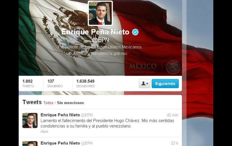 Internacional | Envían sus muestras de apoyo tras el fallecimiento del presidente de Venezuela Políticos mexicanos envían condolencias por muerte de Chávez Tras el fallecimiento del presidente de Venezuela las reacciones de apoyo se hacen presentes en los actores de la política mexicana Por: EL INFORMADOR 5 de marzo de 2013 - 16:34 hs GUADALAJARA, JALISCO (05/MAR/2013).- Minutos después de darse a conocer el fallecimiento del mandatario venezolano Hugo Chávez, personalidades del ambiente político nacional hicieron públicos sus mensajes de condolencia desde sus cuentas en Twitter. El Presidente Enrique Peña Nieto publicó: Lamento el fallecimiento del presidente Hugo Chávez. Mis más sentidas condolencias a su familia y al pueblo venezolano. El gobernador del Estado de México, Eruviel Ávila, envió un mensaje de esperanza y solidaridad: "Mi solidaridad con el pueblo venezolano. Paz y esperanza en esta etapa". Mientras, el ex presidente de México también hizo público un mensaje donde lamentó la muerte del venezolano: "Lamento el deceso del Presidente Hugo Chávez, de quien fui contemporáneo en la Presidencia de la República. Descanse en paz". Por su parte tanto el ex Jefe de gobierno del DF como el Secretario de Hacienda y Crédito Público mostraron su pésame. @m_ebrard: Lamento el fallecimiento de Hugo Chávez y @LVidegaray: Descanse en paz el presidente de Venezuela Hugo Chávez, fueron los mensajes. es de agencia informador} Temas América Latina Venezuela Hugo Chávez Enrique Peña Nieto Twitter Decesos de personalidades Lee También Lugar de Sudamérica prohíbe Halloween por usar símbolos vinculados a la muerte Equipos que podrían quedar eliminados del Play In en la jornada doble de la Liga MX ¿Dónde ver EN VIVO el partido de J14 América vs Puebla? Venezuela Recibe las últimas noticias en tu e-mail Todo lo que necesitas saber para comenzar tu día Registrarse implica aceptar los Términos y Condiciones