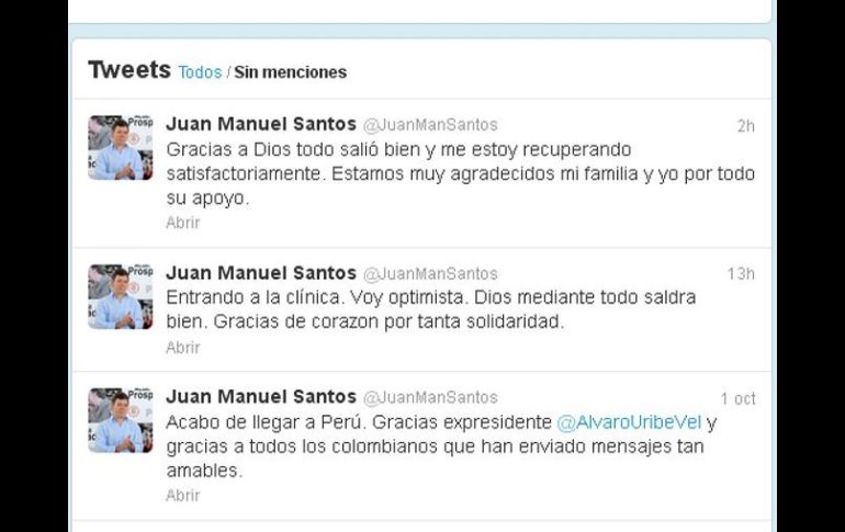 Internacional | Santos dijo a través de su cuenta de Twitter que se está recuperando satisfactoriamente Presidente de Colombia confirma éxito de su operación Santos dijo a través de su cuenta de Twitter que se está recuperando satisfactoriamente Por: AFP 3 de octubre de 2012 - 18:03 hs Estamos muy agradecidos mi familia y yo por todo su apoyo, escribió el mandatario en su cuenta. Imagen tomada de @JuanManSantos / BOGOTÁ, COLOMBIA (03/OCT/2012).- El presidente de Colombia, Juan Manuel Santos, confirmó a través de la red social Twitter que se está recuperando "satisfactoriamente" de la operación a la que fue sometido en la mañana de este miércoles para extraerle un tumor cancerígeno de próstata. "Gracias a Dios todo salió bien y me estoy recuperando satisfactoriamente. Estamos muy agradecidos mi familia y yo por todo su apoyo", escribió el mandatario en su cuenta de la red social. Horas antes, el equipo médico de Santos había informado de que la intervención quirúrgica había sido "exitosa y sin complicaciones" y que el mandatario se encontraba descansando en su habitación de la clínica Santa Fe de Bogotá acompañado de su familia. A Santos, de 61 años, se le había diagnosticado un pequeño tumor cancerígeno en la próstata, con muy alta probabilidad de curación. El presidente de Colombia quedará hospitalizado entre dos y tres días, y luego podrá continuar la convalecencia desde su residencia, dijo a la prensa su médico personal, Felipe Gómez. Se espera que hacia las 18:00 locales (23:00 GMT) el equipo médico emita un nuevo informe sobre la evolución del gobernante. Temas América Latina Colombia Cáncer Juan Manuel Santos Lee También Taylor Swift dona 100 mil dólares a niña de dos años que lucha contra el cáncer ¿Dónde ver EN VIVO el partido de J13 Cruz Azul vs América? Zonas del EOU donde aún hay boletos para el Cruz Azul vs América ¿Dónde ver EN VIVO el partido de J13 Santos vs León? Recibe las últimas noticias en tu e-mail Todo lo que necesitas saber para comenzar tu día Registrarse implica aceptar los Términos y Condiciones
