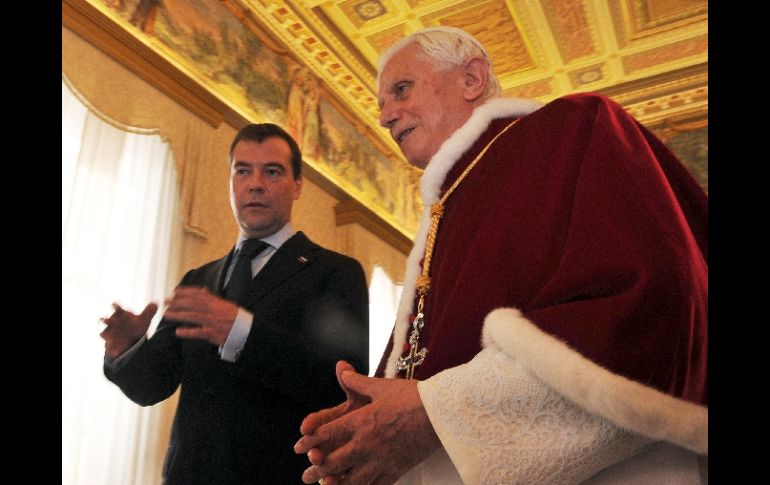 Internacional | Reconocieron la 'amplia' colaboración entre la Santa Sede y la Federación Rusa Recibe Benedicto XVI a Medvedev Reconocieron la 'amplia' colaboración entre la Santa Sede y la Federación Rusa Por: NTX 17 de febrero de 2011 - 10:58 hs CIUDAD DEL VATICANO (17/FEB/2011).- El Papa Benedicto XVI recibió hoy en audiencia privada al presidente ruso, Dimitri Medvedev, informó la oficina de prensa del Vaticano. 'Hoy, 17 de febrero de 2011, el Santo Padre Benedicto XVI ha recibido en audiencia al presidente de la Federación Rusa, Dimitri Medvedev', dijo un comunicado. Informó que posteriormente, el presidente, acompañado por el ministro de Asuntos Exteriores, Sergei Lavrov, se reunió con el cardenal secretario de Estado, Tarcisio Bertone, y con el arzobispo Dominique Mamberti, secretario para las Relaciones con los Estados. 'En el curso de los cordiales coloquios, se ha expresado la satisfacción por el estado de las buenas relaciones bilaterales y se ha subrayado el deseo de fortalecerlas, también tras el establecimiento de las relaciones diplomáticas plenas', indicó la Santa Sede. Señaló que durante los encuentros se reconoció la 'amplia' colaboración entre la Santa Sede y la Federación Rusa, tanto en la promoción de los valores humanos y cristianos específicos, como en el ámbito cultural y social. 'Posteriormente se ha hecho hincapié en la contribución positiva que el diálogo interreligioso puede ofrecer a la sociedad. Finalmente se ha hablado de la situación internacional, con especial referencia a Oriente Medio', anotó. La reunión entre el Pontífice y Medvedev duró 35 minutos. El presidente ruso regaló a Benedicto XVI la Enciclopedia Ortodoxa y dos libros del expresidente ruso Boris Yeltsin. Temas Europa Ciudad del Vaticano Papa Benedicto Dimitry Medvedev Recibe las últimas noticias en tu e-mail Todo lo que necesitas saber para comenzar tu día Registrarse implica aceptar los Términos y Condiciones