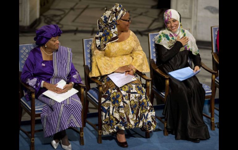 Internacional | Combaten la injusticia, la dictadura y la violencia sexual Reciben tres mujeres Premio Nobel de la Paz 2011 Combaten la injusticia, la dictadura y la violencia sexual Por: AP 10 de diciembre de 2011 - 06:45 hs Las ganadoras del Nobel son la presidente liberiana Ellen Johnson Sirleaf (izq), Leyma Gbowee y la yemení Tawakkul Karman. AFP / OSLO, NORUEGA (10/DIC/2011).- Tres mujeres que combaten la injusticia, la dictadura y la violencia sexual en Liberia y Yemen recibieron el sábado el Premio Nobel de la Paz 2011 en la capital noruega. La presidenta liberiana Ellen Johnson Sirleaf, su compatriota Leymah Gbowee y la yemení Tawakkul Karman recibieron sus diplomas y medallas en medio de una ovación en el ayuntamiento de Oslo. El presidente del comité Nobel, Thorbjoern Jagland, dijo que las tres representan la lucha "por los derechos humanos en general y de las mujeres por la igualdad y la paz en particular". Temas Europa Mujeres Noruega Premio Nobel de la Paz Recibe las últimas noticias en tu e-mail Todo lo que necesitas saber para comenzar tu día Registrarse implica aceptar los Términos y Condiciones