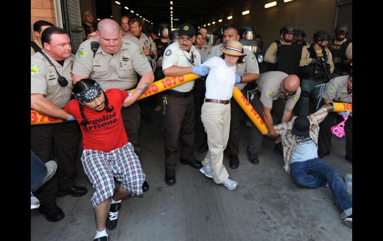 Internacional | Defensores de derechos civiles llegan a Phoenix Repudian la entrada de ley Arizona Decenas de activistas bloquean la oficina del sheriff Joe Arpaio; el acto de desobediencia civil termina con 50 detenidos Por: EL INFORMADOR 30 de julio de 2010 - 04:26 hs Varios opositores a la ley Arizona protestan afuera de la oficina del alguacil de Maricopa, Joe Arpaio. AFP / PHOENIX, ARIZONA (30/JUL/2010).- La marcha contra la entrada en vigencia de la ley antiinmigrante SB 1070 de Arizona dejó en Phoenix al menos 50 opositores detenidos, por desobediencia civil, sobre todo a la entrada de la oficina del alguacil de Maricopa, Joe Arpaio, conocido como cazador de ilegales. Cientos de manifestantes llegaron a la capital de Arizona procedentes de distintos puntos de Estados Unidos, para repudiar la ley firmada por la gobernadora Jan Brewer, sin importar que el miércoles la jueza Susan Bolton vetó los apartados de tinte racista. Por cierto, grupos opuestos al dictamen de la jueza federal lanzaron amenazas contra ésta, por distintos medios, informó el organismo encargado del sistema jurídico en Arizona. Los defensores de los derechos civiles instaron a las escuelas públicas, a la población, a los gobiernos de las ciudades y a la Policía local a no cumplir con esta ley, con una marcha que fue desde la iglesia hasta las oficinas del sheriff del condado, Joe Arpaio. Al menos unas 500 personas mantuvieron bloqueada la intersección de la calle Washington y la avenida Uno del centro de Phoenix para protestar contra las políticas antiinmigrantes de Arpaio. Agitando banderas mexicanas y estadounidenses y cantando canciones, los manifestantes portaban pancartas en las que se podía leer: “Cesen las redadas, no más expulsiones” y “Dejen de cazar a los inmigrantes ya”. Cuando llegaron al edifico del sheriff Arpaio, que suele presentarse a sí mismo como un hombre duro y despiadado cazador de inmigrantes ilegales, la Policía los esperaba con sus uniformes antidisturbios. Una docena de manifestantes se encadenó a las puertas de la cárcel del condado de Maricopa, hasta que ayudantes del sheriff salieron del edificio y los llevaron dentro. Arpaio había advertido que aquellos que causaran disturbios serían arrestados, y las autoridades de Phoenix indicaron que se habían registrado más de cuatro docenas de detenidos. “Todos estos manifestantes que vienen aquí de donde sea y los críticos locales no van a cambiar la manera como Arizona o su sheriff lucharán contra nuestro problema de inmigración ilegal”, señaló Arpaio en un comunicado. En Nueva York también hubo marcha contra la ley de Arizona. Cientos de personas cruzaron a pie el puente de Brooklyn. Aprovecharon para insistir al Gobierno de Barack Obama que acelere una reforma migratoria que abra camino a la legalización de millones de indocumentados que residen y trabajan en la Unión Americana. Analista desmenuza la SB 1070Desolador, el panorama de los migrantes La situación de los migrantes en Arizona queda en extrema vulnerabilidad. Para el investigador en temas de la frontera, Eduardo González, el migrante queda con el sentimiento de rechazo total por parte de la sociedad en esa Entidad, lo que representa una condena discriminatoria. “La situación en que se ubican los migrantes sigue siendo de deserción, de mucha vulnerabilidad, no tanto por la ley misma, sino por el ambiente antiinmigrante que ha generado la promulgación de la ley y la contrabatalla del Gobierno federal”. Para revertir la Ley SB 1070 que atenta contra los derechos civiles y principios de igualdad, los ciudadanos se organizaron y ayer continuaron manifestándose en las calles de Arizona y en diferentes metrópolis de la Unión Americana, como Nueva York, para que la legislación desaparezca por completo y así evitar el acoso de las autoridades. El académico de la Universidad de Guadalajara (UdeG) y del Tec de Monterrey describe el panorama del migrante como desolador, ya que según las encuestas en la nación del Norte, 60% de los estadounidenses está a favor de una ley como la SB 1070. “La decisión de la jueza (Susan Bolton) sólo viene a aligerar un poco la condición del migrante, pero no es suficiente”, para que sea respetado. Si se hubiera aprobado la norma tal como la propuso la gobernadora Jean Brewer, las condiciones de contratación serían peores a las actuales, además los migrantes tendrían que ir a refugiarse a otros estados, y quizá una de la consecuencias inevitables sería que “otros estados empezaran a legislar en la misma dirección que Arizona para blindarse de las personas que saldrían a otros lugares, como ya lo hace Utah después de ver que empezaron a llegar migrantes de otros estados”, señaló el investigador Eduardo González. Más allá de una disputa legal por aprobar o rechazar la promulgación de la SB 1070, la batalla electoral cruza la discusión. Por un lado, el Gobierno de Barack Obama buscó los votos de la comunidad migrante hispana, que representaron cerca de 10% de los sufragios para que fuera electo presidente. Y en el lado contrario: “Veo que los republicanos tienen muchas posibilidades de perder Arizona y decidieron jugarse el poco capital político que tienen con esta ley, así buscan afianzar y ganar más votos. Para las elecciones de noviembre Obama vuelve a jugarse la carta de los latinos” con la intención de ganar votos para los demócratas, razonó el estudioso en temas migratorios. Fabián Ramírez Flores Urgen a la reforma migratoria Para el legislador demócrata Luis Gutiérrez la victoria conseguida con el bloqueo parcial de la ley antiinmigrante de Arizona puede jugar en contra del Gobierno estadounidense si no impulsa una reforma migratoria. “No puedes ganar por un lado y por otro lado no llevar a cabo tu responsabilidad”. Testimonio“Agradecemos a quienes pelean por nosotros” Acaba de llegar del trabajo y está haciendo la comida, pero eso no impide que atie