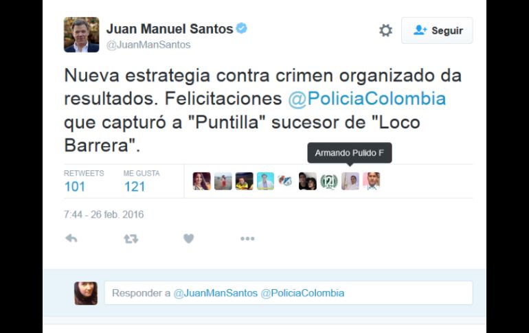 Internacional | Mauricio Pachón Rozo trabajaba en alianza con capos de Centroamérica, EU y Europa Santos reporta captura de importante narco colombiano Mauricio Pachón Rozo trabajaba en alianza con narcotraficantes de Centroamérica, EU y Europa Por: AP 26 de febrero de 2016 - 19:36 hs Santos reconoció a la Policía de Colombia por la captura del 'Puntilla'. TWITTER / @JuanManSantos BOGOTÁ, COLOMBIA (26/FEB/2016).- El presidente Juan Manuel Santos informó el viernes la captura de un importante narcotraficante en el noreste del país. A través de su cuenta de Twitter, el mandatario se refirió al arresto en la localidad de Cimitarra, en el departamento colombiano de Santander, de Mauricio Pachón Rozo, alias "Puntilla". Santos sostuvo que Pachón era el sucesor de Daniel "el Loco" Barrera, un temido narcotraficante colombiano que fue capturado en Venezuela y luego extraditado a Estados Unidos en julio de 2013. "Nueva estrategia contra crimen organizado da resultados. Felicitaciones @PoliciaColombia que capturó a 'Puntilla' sucesor de 'Loco Barrera''', escribió el mandatario en la red social. El ministro de la defensa Luis Carlos Villegas dijo en rueda de prensa que se trata de "un gran golpe a las redes internacionales del narcotráfico, ya que 'Puntilla' trabajaba en alianza con narcotraficantes de Centroamérica, Estados Unidos y Europa". "Se le acusa de tráfico ilegal de droga y homicidios, y se le entregará la Fiscalía General de la Nación" para ser procesado, agregó Villegas. En tanto, la policía reportó en la jornada la detención de 17 personas que al parecer formaban parte de una red dedicada al narcotráfico entre Colombia y España. La organización criminal estaba integrada por 10 colombianos, seis españoles y un mexicano, explicó la policía antinarcóticos en un comunicado. Quince arrestos se produjeron en España y dos en Colombia. El grupo enviaba a Europa la droga desde los puertos y aeropuertos de Colombia, Brasil y Panamá. Adicionalmente utilizaba empresas de fachada para lavar el dinero producto de sus actividades ilegales. Contra todos los aprehendidos había circulares rojas de Interpol. Los investigadores lograron establecer el envío a Europa de cinco contenedores desde un puerto brasileño. El barco hizo tránsito en Las Palmas de Gran Canaria, donde fueron hallados 60 kilos de cocaína. Según el reporte oficial, los detenidos también habrían participado en otro envío a Europa de 90 kilos de cocaína. Temas América Latina Colombia Narcotraficantes Juan Manuel Santos Lee También Esta es la verdadera identidad del "Juan Gabriel" captado en París Chivas y América calientan en redes el Clásico Nacional de la Fecha FIFA Sociales: El Informador inicia una nueva etapa con la moderna imprenta "Doña Stella" Dueño de Atlas y Santos, es absuelto del proceso penal promovido por el SAT Recibe las últimas noticias en tu e-mail Todo lo que necesitas saber para comenzar tu día Registrarse implica aceptar los Términos y Condiciones