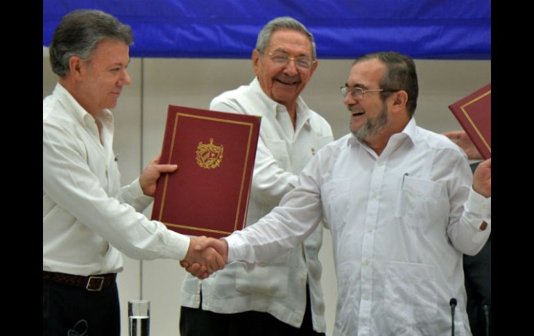 Internacional | La dejación de armas es el paso previo para terminar el conflicto de más de 50 años Santos y las FARC sellan acuerdo de cese del fuego bilateral El presidente colombiano y el jefe máximo de la guerrilla firman el paso previo para terminar el conflicto de más de 50 años Por: NTX 23 de junio de 2016 - 12:24 hs LA HABANA, CUBA (23/JUN/2016).- El presidente colombiano Juan Manuel Santos y la guerrilla de las FARC sellaron el jueves el acuerdo del cese bilateral y definitivo del fuego, el paso previo para dar por terminado un conflicto armado y político que lleva más de medio siglo y ha dejado unos 220 mil muertos. Santos y el jefe máximo de las FARC, Rodrigo Londoño, conocido por su nombre de guerra como “Timoleón Jiménez” o “Timochenko”, atestiguaron la firma del documento hecho por el jefe negociador gubernamental Humberto de la Calle y el comandante de las FARC, Iván Márquez. Ambos suscribieron el "Acuerdo para el Cese al Fuego y de Hostilidades Bilateral y Definitivo; la Dejación de las armas". La firma del documento se hizo en el salón de protocolo de El Laguito, en La Habana, el cual fue logrado en intensa negociación entre las delegaciones del Gobierno y las guerrillas de las Fuerzas Armadas Revolucionarias de Colombia (FARC). En el acto, Santos asegura que este acuerdo significa "ni más ni menos el fin de las FARC como grupo armado". "No solamente se acordó el fin de las confrontaciones, sino que también se definió un cronograma preciso para que las FARC dejen las armas para siempre. Esto significa ni más ni menos el fin de las FARC como grupo armado", dijo desde La Habana. Por otro lado, afirmó que el acuerdo final será firmado en Colombia, después de que las negociaciones se hayan desarrollado desde el comienzo en Cuba. En la ceremonia estuvieron presentes los presidentes de Cuba, Raúl Castro, Michelle Bachelet (Chile), Nicolás Maduro (Venezuela), Enrique Peña Nieto (México), Salvador Sánchez Cerén (El Salvador, Danilo Medina (República Dominicana) y el secretario General de las Naciones Unidas, Ban Ki-Moon, entre otras personalidades. Tras la firma del documento, los presentes se pusieron de pie y aplaudieron el hecho que pone fin al conflicto más antiguo del continente americano. El acuerdo contiene las garantías de seguridad y la lucha contra las organizaciones criminales responsables de homicidios y masacres o que atentan contra defensores de Derechos Humanos, movimientos sociales o movimientos políticos. El documento da a conocer las reglas y el procedimiento para el cese al fuego, que podría arrancar en un plazo de 40 días bajo la verificación de las Naciones Unidas. El anuncio fue hecho por los delegados de los países garantes, Cuba y Noruega, en presencia de Santos, el máximo jefe de las FARC, Rodrigo Londoño o "Timochenko", y el secretario general de Naciones Unidas Ban Ki-moon, entre otras personalidades. Desde fines de 2012, la administración de Santos y las rebeldes Fuerzas Armadas Revolucionarias de Colombia (FARC) llevan adelante en La Habana un proceso de paz. Con información de AP y EFE Temas América Latina FARC Colombia Juan Manuel Santos Diálogos de Paz Lee También México y Estados Unidos refuerzan cooperación en seguridad fronteriza “Nadie nos vio partir” se estrena hoy en Netflix Ebrard buscará evitar imposición de aranceles en su visita a EU ¿Dónde ver Argentina vs Colombia: semifinal del Mundial Sub-20? Recibe las últimas noticias en tu e-mail Todo lo que necesitas saber para comenzar tu día Registrarse implica aceptar los Términos y Condiciones