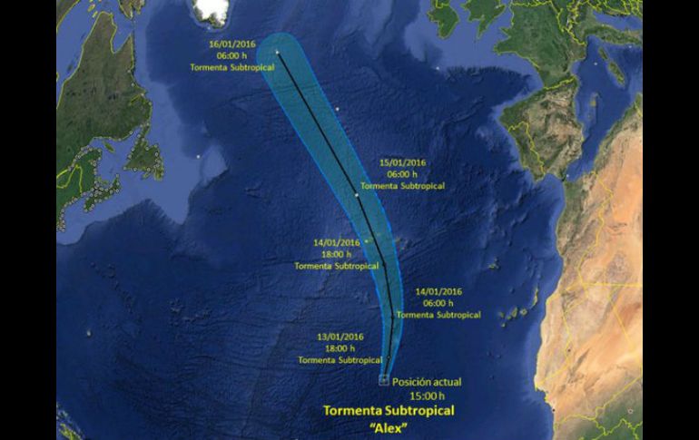 El Centro Nacional de Huracanes de Estados Unidos informó el miércoles que la tormenta subtropical Alex podría provocar poderosos vientos y fuertes lluvias en las Azores esta semana. Es tan solo la cuarta ocasión que se forma una tormenta en el mes de enero desde 1851, según la página de Facebook del Centro Nacional de Huracanes.Las Azores podrían recibir entre 7.5 y 13 centímetros (tres y cinco pulgadas) de lluvia hasta el viernes, y algunas zonas podrían recibir hasta 18 centímetros (siete pulgadas). Los meteorólogos advierten que esto podría causar inundaciones y deslaves. Se prevé que vientos huracanados lleguen al archipiélago hacia la tarde del jueves.Los vientos máximos sostenidos de la tormenta eran de 85 kilómetros por hora (50 millas por hora) la tarde del miércoles. Se movía hacia el noreste a 22 kph (14 mph) y su centro se ubicaba a unos mil 260 kilómetros (785 millas) hacia el sur de las Azores.