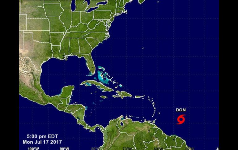 MIAMI, ESTADOS UNIDOS (17/JUL/2017).- El Centro Nacional de Huracanes (CNH) de EU. informó hoy de la formación de la tormenta tropical Don, la cuarta de esta temporada en el Atlántico, que está situada al este de la islas caribeñas de Barlovento y se mueve en dirección oeste a 17 millas por hora (28 km/h).Las Barlovento son un archipiélago situado al este de la cuenca del Mar Caribe, integrado por las islas septentrionales de las Pequeñas Antillas. Algunas de las islas principales son Granada, Martinica, Santa Lucía, Barbados, Guadalupe, Dominica, Trinidad y Tobago.A las 21.00 GMT Don se encontraba a 485 millas (780 km) al este-sureste de Barbados y a unas 595 millas (955 km) de Trinidad y presentaba vientos máximos sostenidos de 40 millas por hora (65 km/hora) con ráfagas de mayor velocidad.Hay ya advertencia de tormenta tropical para Granada y de vigilancia de tormenta tropical para Barbados, San Vicente y las Granadinas y Santa Lucía.El CNH señaló que se espera que Don mantenga el rumbo actual hasta el miércoles y que a medida que avance se vaya produciendo un descenso gradual de la velocidad de traslación.El centro de Don de moverá hacia las islas de Barlovento a últimas horas del martes y no se preven cambios en la fuerza de los vientos en 48 horas.Pueden producirse acumulación de agua por la lluvias de 2 a 4 pulgadas (5 a 10 centímetros) en las islas de Barlovento hasta el miércoles por la mañana.La primera tormenta tropical de 2017 fue Arlene, que se formó en abril pasado en mitad del Atlántico, más de un mes antes del comienzo de la temporada, y luego siguieron Bret y Cindy.La Administración Nacional de Océanos y Atmósfera de Estados Unidos (NOAA, por sus siglas en inglés) anunció el 25 de mayo que se prevé una temporada de huracanes en el Atlántico con registros "por encima" de lo normal, con la formación de 11 a 17 tormentas tropicales, de las cuales entre 5 y 9 se convertirían en huracanes y entre 2 y 4 serían de categoría mayor.