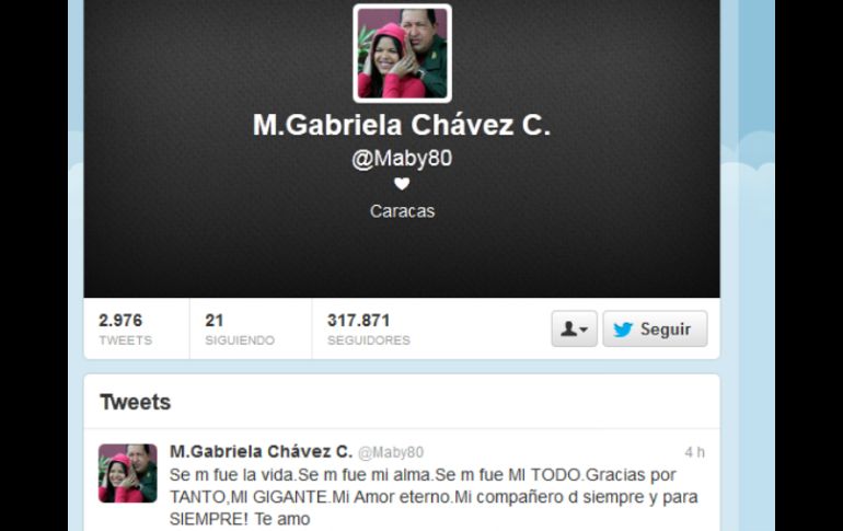 Internacional | Agradece a su padre por ''tanto'', en una red social ''Se me fue la vida'', expresa hija de Chávez Escribe a su padre y le agradece por ''tanto'', en una red social Por: EFE 7 de marzo de 2013 - 18:34 hs CARACAS, VENEZUELA (07/MAR/2013).- María Gabriela Chávez, hija del presidente venezolano, Hugo Chávez, le agradeció hoy "por tanto" a su "gigante", "amor eterno" y "compañero de siempre" en un mensaje en la red social Twitter, en el que lamentó que se le fue su "todo". "Se m fue la vida. Se m fue mi alma. Se m fue MI TODO. Gracias por TANTO, MI GIGANTE. Mi Amor eterno. Mi compañero d siempre y para SIEMPRE! Te amo", escribió la hija de Chávez en su cuenta @Maby80. María Gabriela estuvo anoche junto a sus tres hermanos frente al féretro de su padre, que permanece en la capilla ardiente en la Academia Militar de Caracas, hasta donde han llegado cientos de miles de seguidores de Chávez para darle el último adiós. Ya antes, tras conocerse el fallecimiento de Chávez, María Gabriela había señalado en la misma red social: "No tengo palabras. Eternamente, GRACIAS! Fuerza! Debemos seguir su ejemplo. Debemos seguir construyendo PATRIA! Hasta siempre papito mío!". En @Maby80, la hija del jefe de Estado había enviado ánimo a los seguidores de su padre luego de anunciarse, el pasado lunes, un empeoramiento de salud, pero también echó mano de la red social en diciembre para pedir que cesaran las "mentiras". "Respeto a la familia y sobre todo respeto a mi pueblo. Basta d mentiras! Estamos junto a papá, VIVOS, luchando y recuperando la salud. CON DIOS", escribió el pasado 22 de diciembre, once días después de que Chávez se sometiera a la cuarta operación en 18 meses en Cuba. El jefe de Estado viajó a la isla para operarse a raíz de una segunda recaída del cáncer que le habían diagnosticado a mediados de 2011. Durante el golpe de Estado que en abril de 2002 apartó brevemente a Chávez del poder, María Gabriela aseguró en una entrevista a la televisión cubana que su padre no había renunciado, y que en Venezuela se había instaurado "una dictadura de extrema derecha". En julio de 2011, Chávez explicó que María Gabriel le aconsejó que leyera él mismo y de pie el mensaje en el que había anunciado días antes que había sido operado de un cáncer. Temas América Latina Venezuela Hugo Chávez Lee También ¿Dónde ver EN VIVO el partido de J13 Cruz Azul vs América? Trump asegura que Maduro le ofreció 'de todo' para evitar conflictos con EU Zonas del EOU donde aún hay boletos para el Cruz Azul vs América NYT revela que Trump autorizó a la CIA realizar operaciones en Venezuela Recibe las últimas noticias en tu e-mail Todo lo que necesitas saber para comenzar tu día Registrarse implica aceptar los Términos y Condiciones