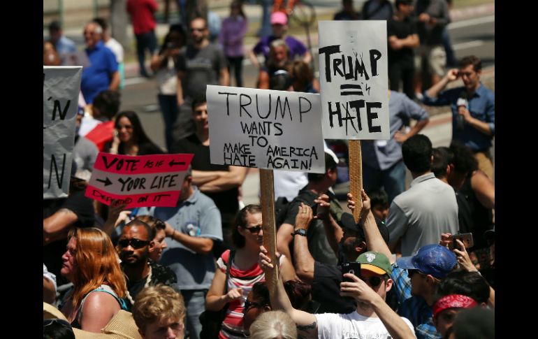 CALIFORNIA, ESTADOS UNIDOS (27/MAY/2016).- El virtual candidato republicano a la Presidencia, Donald Trump, se presentó este viernes en un evento masivo en Fresno, California, donde causó de nuevo protestas de cientos de manifestantes que rechazaron su retórica antiinmigrante. Los manifestantes portaban pancartas y gritaban consignas como "Mantener fuera al odio de nuestro estado" y "Trump necesita ser botado", mientras al interior del recinto cientos vitorearon al magnate de los bienes raíces. Trump continuó este viernes con sus actividades en California con vistas a las elecciones primarias del 7 de junio próximo. Esta tarde, el virtual candidato a la Casa Blanca tendrá otro evento masivo en el centro de Convenciones de San Diego, donde también se anticipan protestas. En Fresno, en el Valle central de California, donde la mayoría de la población es latina, Trump asistió a un evento masivo en la arena Selland, en el centro de esta ciudad agrícola, que empezó 45 minutos después de lo programado. Durante el acto, Trump destacó que es urgente resolver el problema del agua en la región, una demanda prioritaria a causa de la sequía que sufre el estado, además de criticar a la precandidata demócrata Hillary Clinton, de quien dijo: "miente mucho". También arremetió contra el presidente Barack Obama al afirmar que "es completamente incompetente", lo que generó expresiones de apoyo entre sus simpatizantes. Asimismo, Trump retomó el lema de su campaña de "hacer de nuevo grande a Estados Unidos" y prometió que tomará medidas para lograr unas fuerzas militares "más grandes, mejores, más fuertes que nunca antes". Luego que varias mujeres le gritaran desde el público, Trump sostuvo: "Créanme, yo quiero a las mujeres y además les tengo un gran respeto", lo que de nuevo fue festejado con gritos y aplausos. Autoridades policiacas reportaron algunos enfrentamientos entre seguidores y opositores de Trump afuera de la arena, sin que se registraran mayores incidentes. Afuera del recinto, más de 200 manifestantes en contra de la visita del aspirante a la Presidencia de Estados Unidos portaban pancartas con leyendas como "Boten a Trump", "Alto a Trump" y "No al racismo", entre otras.