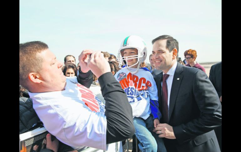 Internacional | Elección 2016 en Estados Unidos Sin cambio de 'ánimo', Clinton ganará, dice Marco Rubio El candidato republicano dice que él puede unificar el partido Por: EFE 5 de marzo de 2016 - 00:56 hs Selfie. Un simpatizante de Marco Rubio, con su hijo y el precandidato. AP / ESTADOS UNIDOS (05/MAR/2016).- El aspirante republicano Marco Rubio, tercero en la carrera interna por la candidatura, dijo que si no cambia drásticamente el “estado anímico” en el Partido Republicano, en referencia al liderazgo de Donald Trump, Hillary Clinton ganará las elecciones. “Ésta es la situación difícil que quiero que evitemos”, dijo Rubio al programa “Today” de la emisora NBC. “No quiero que tengamos un candidato que la gente tenga que aceptar con resignación o por el cual deba dar explicaciones para votarlo. Es lo que tratamos de evitar. Y la única manera de hacerlo es unificarse en torno a una campaña como la mía. Porque yo puedo unificar a este partido y hacerlo crecer”. “Si éste es el estado de ánimo en octubre, perderemos ante Hillary Clinton”. Temas Norte América Elecciones EU Estados Unidos Hillary Clinton Republicanos Donald Trump Recibe las últimas noticias en tu e-mail Todo lo que necesitas saber para comenzar tu día Registrarse implica aceptar los Términos y Condiciones