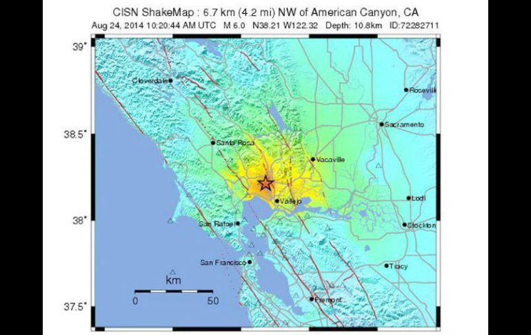 Internacional | Se reportan cortes de energía y fugas de gas en Napa Sismo de magnitud 6.0 sacude el norte de California Se reportan cortes de energía y fugas de gas en Napa Por: EFE 24 de agosto de 2014 - 05:51 hs Mapa publicaod por el Servicio Geológico de EU que muestra la zona afectada por el terremoto. EFE / LOS ÁNGELES, CALIFORNIA (24/AGO/2014).- Un terremoto de magnitud 6.0 se ha registrado en el norte de California (EEUU) hacia las 3.20 horas local (10.20 horas GMT), informó el Servicio Geológico estadounidense. Según ese Servicio, el epicentro se situó a diez kilómetros de profundidad, a unos diez kilómetros de la ciudad de Napa y a poco más de 80 de Sacramento. El 'Los Angeles Times' informó de cortes de suministro eléctrico y de fugas de gas en Napa, mientras los departamentos de bomberos inspeccionaban posibles daños a puentes y otras construcciones. No ha habido información de daños personales. Ese temblor ha sido seguido en la media hora siguiente por media docena adicionales, de menor magnitud, el mayor de los cuales ha alcanzado la de 4, según el Servicio Geológico. Temas Norte América Estados Unidos Sismos California Lee También Asesinan a maestra en Guerrero presuntamente por una calificación Llega "Melissa" al Atlántico; esta es la trayectoria de la tormenta A punto de aparecer el ciclón "Melissa"; a esta distancia está de México ESTOS estados registraron sismos durante la madrugada de este martes Recibe las últimas noticias en tu e-mail Todo lo que necesitas saber para comenzar tu día Registrarse implica aceptar los Términos y Condiciones