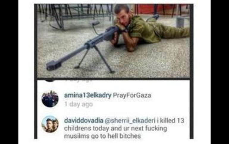 Internacional | Causa indignación entre usuarios de redes sociales Soldado israelí presume haber matado a 13 niños en Gaza Causa indignación entre usuarios de redes sociales Por: EL INFORMADOR 31 de julio de 2014 - 19:11 hs Sus fotografías circulan en redes sociales. ESPECIAL / GUADALAJARA, JALISCO (31/JUL/2014).- Un soldado israelí que presumió en su cuenta de Instagram haber matado a 13 niños en Gaza, causó indignación en las redes sociales. Junto a una serie de fotos donde lucía uniforme y portaba algunas armas, David Dovadia escribió 'Hoy maté a 13 niños, y ustedes musulmanes son los próximos en ir al infierno'. La reacción no se hizo esperar, y la gente respondió a la publicación con ataques hacia su persona, lo que provocó que cerrara su cuenta. Pantallazos de su publicación circulan tanto en Instagram como en Twitter, algunas reacciones son: @Corderoen #DavidDovadia Ya te tocara a ti asesino sionista fascista la justicia de Dios caera sobre ti por haber asesinado 13 niños @ccarabali #DavidDovadia que lo pagues en donde mas te duela @zainbangash #DavidDovadia Desearía poder cortarte en pedazos y pegar 'Odio a Israel' en cada inmunda parte de tu cuerpo y mandárselas a @netanyahu @efrahe45 #DavidDovadia tendras tu rescompensa departe de Dios.Dios te castigara y sera un castigo por siempre @margie_ortiz Increible, que inhumano, sin palabras el mundo llora. #daviddovadia @gerardodemateo Me da tanto asco el nombre de #DavidDovadia que ojalá desaparezca bajo un túnel d #Gaza lleno de ratas como el dispuestas a comerle los ojos Temas Medio Oriente Conflicto Israel-Palestina Franja de Gaza Niños Redes Sociales Lee También Zelenski informa a Trump sobre ataques rusos y discuten reforzar la defensa aérea de Ucrania ¿Cuál era la relación entre el barco pirata hundido en Vallarta y Colón? ¿Qué hundió al barco pirata "Marigalante" en Vallarta? Los sesgos de género prevalecen en internet Recibe las últimas noticias en tu e-mail Todo lo que necesitas saber para comenzar tu día Registrarse implica aceptar los Términos y Condiciones