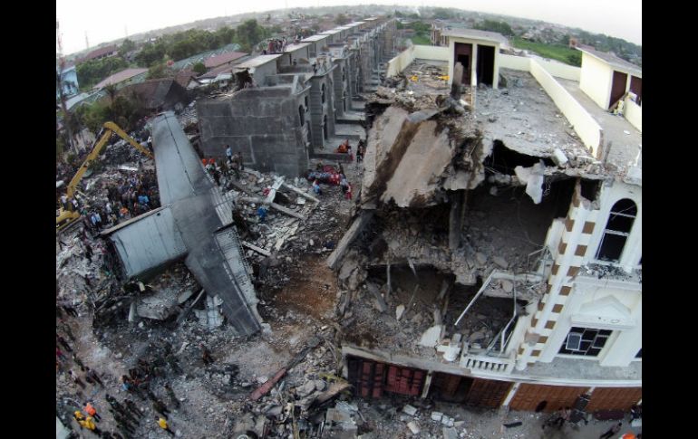 Internacional | La policía informa que lograron recuperar 141 cuerpos de la aeronave Hércules C-130 Sube a 141 cifra de muertos tras accidente de avión militar en Indonesia La policía informa que lograron recuperar 141 cuerpos de la aeronave Hércules C-130 en Medan Por: AFP 30 de junio de 2015 - 20:35 hs MEDAN, INDONESIA (30/JUN/2015).- Al menos 141 personas murieron al estrellarse el martes un avión militar en una zona habitada de la ciudad indonesia de Medan, en la isla de Sumatra, indicó este miércoles la policía en un nuevo balance. "Recuperamos 141 cuerpos", dijo Agustinus Tarigan, portavoz policial. El avión, un Hércules C-130 de 51 años, se estrelló este martes provocando daños en edificios e incendiando vehículos. El avión, un Hércules C-130 de 51 años, se estrelló el martes en una zona residencial de esta ciudad de más de dos millones de habitantes, provocando daños en edificios e incendiando vehículos. Los equipos de rescate despejaban el miércoles montañas de escombros a la búsqueda de eventuales víctimas. Muchos pasajeros del avión son miembros de las familias de los militares y mujeres. Al menos un niño figura entre las víctimas. Es la segunda vez que Medan vive una catástrofe aérea. En 2005, un avión de la compañía aérea local Mandala Airlines se estrelló poco después de su despegue en una zona muy poblada, causando la muerte de 150 personas. Indonesia, que tiene un balance mediocre en materia de seguridad aérea militar y civil, ha sufrido varios accidentes aéreos en su historia. Temas Asia Muertes Desapariciones y caídas de aviones Indonesia Accidentes aéreos Lee También Cierran dos tramos de avenida Juárez por caída de un poste y de ramas Desaparecidos, la prioridad del gasto Bebé sobreviviente a explosión de Iztapalapa comenzará rehabilitación Helicóptero se desploma en autopista de Sacramento, esto se sabe del accidente Recibe las últimas noticias en tu e-mail Todo lo que necesitas saber para comenzar tu día Registrarse implica aceptar los Términos y Condiciones