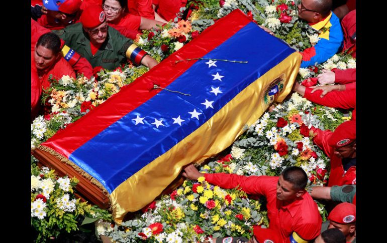 Internacional | Durante el recorrido, el cuerpo es acompañado por bandas marciales y de guerra Trasladan restos de Chávez a Academia Militar El féretro es colocado en el techo de una carroza, rodeado de flores y cubierto con la bandera venezolana Por: NTX 6 de marzo de 2013 - 08:57 hs CARACAS, VENEZUELA (06/MAR/2013).- Los restos del presidente venezolano Hugo Chávez, quien falleció esta víspera, salieron desde el Hospital Militar de Caracas rumbo a la Academia Militar ubicada en el Fuerte Tiuna de esta capital. Una guardia militar de honor, funcionarios de gobierno, un sacerdote católico y la familia de Chávez despidieron, al son del himno nacional, en la puerta del recinto asistencial, el féretro cubierto por la bandera venezolana. La madre del gobernante, Elena Frías, lloró desconsolada durante los minutos en los cuales el sacerdote oró por el descanso de Chávez, cuyo ataúd, rodeado de una guardia militar, fue rociado con agua bendita. El féretro fue colocado en el techo de una carroza rodeado de flores y cubierto con la bandera venezolana. Miles de venezolanos salieron a las calles de Caracas para ver pasar el cortejo y despedir al gobernante, quien falleció esta víspera producto de las complicaciones que le generó el cáncer que se le detectó en 2011. La caravana con los restos de Chávez pasará por varias arterias de esta capital, entre ellas toda la Avenida Bolívar, para llegar al Paseo de Los Próceres, en Fuerte Tiuna, y luego a la Academia Militar, donde será recibido por las autoridades venezolanas. Durante el recorrido es acompañado por bandas marciales y de guerra, las que interpretan himnos "de sentimiento patrio", según precisaron fuentes castrenses. El jefe de Estado será velado hasta el próximo viernes en la Academia Militar, la cual era llamada por el fallecido presidente como la "Casa de los Sueños Azules". Este miércoles se realizará una misa en la Academia Militar y en forma posterior los venezolanos podrán acceder al lugar en forma libre para despedirse del gobernante, quien será sepultado el próximo viernes en un lugar por definir. Temas América Latina Venezuela Hugo Chávez Lee También Premio Nobel de la Paz es para María Corina Machado, líder opositora de Venezuela Chivas viaja con ‘Chicharito’ y Robinho al amistoso ante América en Estados Unidos Estas son las bajas de Chivas para el próximo Clásico Nacional Chivas y América calientan en redes el Clásico Nacional de la Fecha FIFA Recibe las últimas noticias en tu e-mail Todo lo que necesitas saber para comenzar tu día Registrarse implica aceptar los Términos y Condiciones