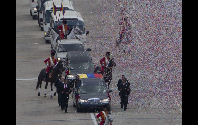 Internacional | Chávez fallece el 5 de marzo, a los 58 años, como consecuencia de un cáncer Traslado de Hugo Chávez al Cuartel de la Montaña comienza El féretro es sacado por miembros de la caballería al patio militar, donde recibe honores con más de mil cadetes formados antes de comenzar un recorrido por la ciudad hasta el Cuartel de la Montaña Por: EFE 15 de marzo de 2013 - 11:45 hs CARACAS, VENEZUELA (15/MAR/2013).- El traslado del féretro del presidente venezolano, Hugo Chávez, comenzó tras un acto solemne en la Academia Militar de Caracas, donde ha estado el cuerpo del mandatario desde el pasado 6 de marzo, para que cientos de miles de personas pasaran a darle el último adiós. El féretro fue sacado por miembros de la caballería vestidos de húsares al patio militar, donde recibió honores con más de mil cadetes formados antes de comenzar un recorrido por la ciudad hasta el Cuartel de la Montaña, donde permanecerán los restos del gobernante hasta encontrar sepultura definitiva. Flanqueado por su escolta personal y seguido por una caravana que encabezaban los padres del fallecido jefe de Estado, Elena y Hugo de los Reyes, familiares, funcionarios y la cúpula militar, el féretro cubierto con el tricolor venezolano recibió honores mientras se escuchaba el himno nacional y salvas de cañones. También se encontraba el presidente de Bolivia, Evo Morales, quien la semana pasada asistió al funeral organizado por el Gobierno de Venezuela y al que acudieron más de 50 delegaciones internacionales y una treintena de jefes de Estado y de Gobierno. El recorrido sobre la explanada del patio militar y una alfombra roja lo continuaron familiares de Chávez mientras los cadetes entonaban "Patria querida", tonada militar que el fallecido gobernante cantó el 8 de diciembre en su último mensaje a los venezolanos. Posteriormente introdujeron el ataúd en un coche fúnebre para dar comienzo el periplo de una caravana de automóviles hasta el lugar de destino. Durante la ceremonia en el patio militar, que fue precedida por una misa y palabras del mayor general Jacinto Pérez Arcay, al que Chávez siempre identificó como maestro; del presidente de la Asamblea Nacional,, Diosdado Cabello, y la hija del fallecido presidente María Gabriela Chávez, aviones sukhoi sobrevolaron el cielo de Caracas. Desde el pasado día 6, el féretro del gobernante ha estado expuesto en la Academia Militar de Caracas para que cientos de miles de personas le dieran el último adiós en una capilla ardiente cuyo acceso se cerró al público alrededor de las 02.30 hora local (07.00 GMT). Chávez falleció el 5 de marzo a los 58 años como consecuencia de un cáncer contra el que luchó durante más de 20 meses y por el que pasó en cuatro ocasiones por el quirófano, la última vez el 11 de diciembre en Cuba en una cirugía de la que ya no se recuperó. El jefe de Estado asumió el poder en febrero de 1999 y en octubre pasado había conquistado su tercera reelección consecutiva para el período 2013-2019, que se inició el pasado 10 de enero y para el cual no pudo juramentarse por su condición de salud. Temas América Latina Venezuela Hugo Chávez Recibe las últimas noticias en tu e-mail Todo lo que necesitas saber para comenzar tu día Registrarse implica aceptar los Términos y Condiciones