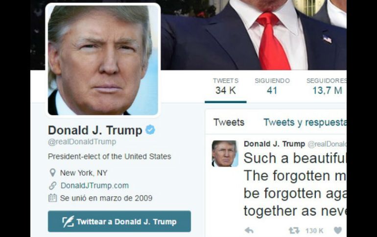 WASHINGTON, ESTADOS UNIDOS (09/NOV/2016).- Su cuenta de Twitter fue una de sus principales armas y altavoz durante la campaña, y el magnate Donald Trump la ha actualizado para reflejar su nueva situación: la de presidente electo de Estados Unidos.Con 13.7 millones de seguidores, junto a la foto y su nombre, Donald J. Trump, aparece ahora en el perfil de Twitter del magnate el cargo de "presidente electo de Estados Unidos"."¡Qué noche tan hermosa e importante! Los hombres y mujeres olvidados nunca más serán olvidados. Nos uniremos como nunca antes", tuiteó de madrugada el candidato republicano a la Casa Blanca y presidente electo desde hace unas horas.Trump, un magnate inmobiliario ajeno a la política hasta hace poco más de un año, consiguió este martes superar los 270 votos electorales necesarios para llegar a la Casa Blanca y tirar por tierra el sueño de su rival demócrata, Hillary Clinton, de convertirse en la primera mujer presidenta de Estados Unidos.A falta de que se confirmen los resultados de Minnesota, Arizona, Michigan y Nuevo Hampshire, Trump obtuvo 279 votos electorales frente a los 218 de Clinton, quien ya felicitó por teléfono al nuevo presidente electo y hablará en breve desde Nueva York.Clinton supera por ahora en el cómputo total de votos a Trump, quien se impuso en el sistema de Colegio Electoral que rige en Estados Unidos y decide la elección del presidente.En su primer discurso como presidente electo, Trump dejó esta madrugada de lado su habitual tono incendiario y llamó a la unidad del país tras una dura campaña electoral.+Sigue la cobertura especial con resultados a detalle