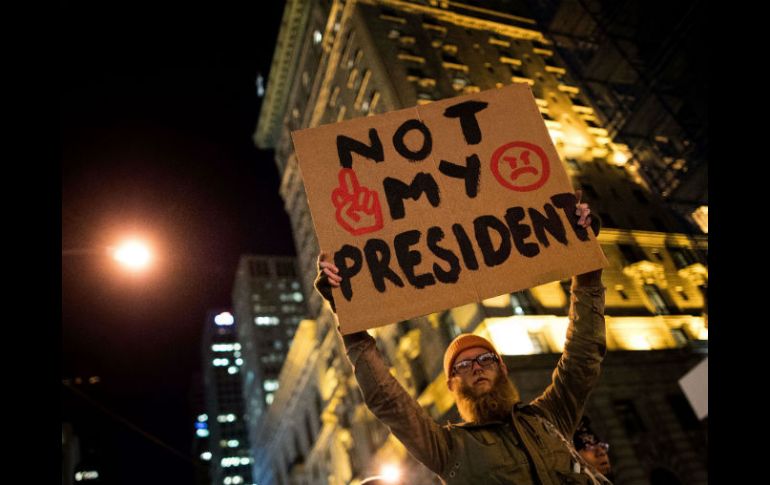 ESTADOS UNIDOS (12/NOV/2016).- El movimiento “No es mi presidente”, surgido luego de que Donald Trump resultara ganador de las pasadas elecciones en Estados Unidos, salió a las calles otra vez con la misma consigna: repudiar el resultado del proceso pero también responder a los actos de racismo que se han registrado en diversas ciudades del país.El presidente electo aseguró a través de un mensaje en Twitter que se trata de “manifestantes profesionales incitados por los medios de comunicación”, lo cual calificó como “injusto”. En cambio, horas más tarde celebró la presencia de un “pequeño grupo” de sus seguidores que también se manifestaron “con pasión por nuestro gran país”, y aseguró sentirse muy “orgulloso”.Sin importar los comentarios acusatorios del magnate, la ola de protestas parece no tener fin, especialmente luego del incremento de casos de xenofobia en varias ciudades: un estudiante en una escuela elemental de Delaware fue agredido físicamente por sus compañeros y los estudiantes hispanos en una escuela de Michigan a quienes les gritaron: ¡Construyan el muro!”