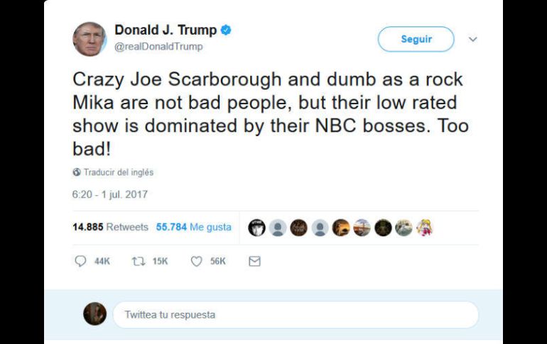BRIDGEWATER, ESTADOS UNIDOS (01/JUL/2017) El presidente Donald Trump prolongó este sábado sus ataques a dos destacados conductores de un programa de cable, sugiriendo sin evidencia que su canal es tendencioso en su contra.La serie de insultos del presidente ha hecho que políticos de ambos partidos lo exhortaran _ aparentemente en vano _ a dejar de lado los ataques personales en 140 caracteres y enfocarse en dirigir al país.Trump fustigó a Joe Scarborough y Mika Brzezinski del programa Morning Joe a través de Twitter. Desde su club de golf en Nueva Jersey escribió: Loco Joe Scarborough y estúpida Mika no son mala gente, pero su programa de bajo rating es dominado por sus jefes de NBC.El presidente también dijo en un tuit el sábado en la mañana que la conocida periodista de TV Greta Van Susteren perdió su programa nocturno en MSNBC porque ¡se negó a acoplarse al odio a Trump!.MSNBC informó esta semana que Van Susteren, que previamente fue anfitriona en Fox News, sería reemplazada.NBC no quiso comentar sobre los tuits sabatinos del presidente.Morning Joe acaba de concluir el trimestre con el mayor nivel de audiencia en la historia del programa. MSNBC no dio una razón oficial para reemplazar el programa de Van Susteren, sin embargo, este iba atrás en los ratings comparado con otros shows.Esta semana Trump recibió condenas de todo el espectro político y social por sus tuits en que trató a Brzezinski de “loca” y que “sangraba de un estiramiento facial” cuando los vio en Florida. Los conductores del canal de cable MSNBC dijeron que Trump mintió acerca de su encuentro en diciembre y cuestionaron su obsesión enfermiza con el programa.Los anfitriones, que son pareja dentro y fuera de pantalla, también dijeron que la Casa Blanca amenazó en publicar una historia sobre ellos en el National Enquirer, que sería dañina para su relación pero podría desaparecer si telefoneaban al presidente y se disculpaban por los duros comentarios. Trump rápidamente los contradijo en Twitter.