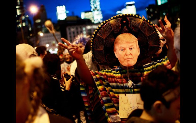 NUEVA YORK, ESTADOS UNIDOS (01/NOV/2016).- Miles de personas participaron la noche del lunes en Nueva York en el desfile anual de Halloween, en el cual destacaron tanto los disfraces alusivos a las catrinas y al Día de Muertos de México, como aquellos relacionados al candidato presidencial Donald Trump. Considerado por sus organizadores como la mayor celebración pública de Halloween en el mundo, el desfile de Nueva York congregó a miles de participantes, muchos de los cuales hicieron gala de una asombrosa creatividad, así como a dos millones de asistentes. Las calles de la parte baja de Manhattan lucieron durante unas tres horas repletas de personajes de cómics, superhéroes, zombies, monstruos, vampiros y demonios. A los contingentes, además, los acompañaron algunos carros alegóricos, y más de 40 músicos o bandas musicales que conferían un ambiente festivo al recorrido. Asimismo, quizá más que en años anteriores, fue visible la presencia de disfraces inspirados directamente de la tradición mexicana del Día de Muertos, con catrinas y calaveras resaltando entre la multitud. Muchos de ellos, además, completaban su atuendo con detalles alusivos a la cultura mexicana, como sombreros, vestidos de china poblana y trajes de mariachi. Como personaje más recurrentes en los disfraces resaltó Trump, un candidato que ha generado angustia a millones de estadunidenses y de inmigrantes, que se sienten amenazados u ofendidos, ya sea por sus declaraciones o por su comportamiento. Muchos combinaron ambas tendencias: Trumps con alusiones a México y los mexicanos, así como al muro y los inmigrantes, que han sido temas constantes en la campaña presidencial del republicano. Meghan Mitchells, quien decidió disfrazarse como una mujer atacada por Trump, cuya máscara se posaba tras ella como si la acosara, expresó que el comportamiento del candidato pertenece a un "desfile del horror". "El comportamiento de personas como Trump es algo que ya debería ser como una leyenda, un error que debemos enterrar en el pasado. No sólo debería asustar a las mujeres y los mexicanos, sino a todo el mundo", declaró Mitchells.