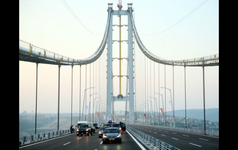 Internacional | Es de seis carriles y cuenta con una longitud total de dos mil 682 metros Turquía inaugura el cuarto puente colgante más largo del mundo Es de seis carriles y cuenta con una longitud total de dos mil 682 metros Por: EFE 30 de junio de 2016 - 16:05 hs El puente de Osmangazi se encuentra sobre el Golfo de Izmit, a unos 50 kilómetros al este de Estambul. AFP / K. Ozer ESTAMBUL, TURQUÍA (30/JUN/2016).- Las autoridades de Turquía han inaugurado hoy el puente de Osmangazi, sobre el Golfo de Izmit, a unos 50 kilómetros al este de Estambul y considerado el cuarto más largo del mundo. El puente de seis carriles, con una longitud total de dos mil 682 metros, tiene un vano (distancia entre las pilas o torres) de mil 550 metros y una altura de 64 metros sobre la superficie del golfo. Es ahora el cuarto puente colgante más largo del mundo y el segundo de Europa, después del Gran Belt en Dinamarca. Forma parte de la nueva autovía de 421 kilómetros que comunica Estambul con Esmirna, la tercera mayor ciudad de Turquía, situada en la costa egea, y que reducirá de casi diez a solo cuatro horas el tiempo de viaje entre estas ciudades. El propio puente evita al viajero rodear el alargado Golfo de Izmit, ahorrando así casi 100 kilómetros de carretera, sin impedir el tráfico marítimo a los puertos de la provincia de Kocaeli situados al final de ese brazo del mar de Mármara. Construido desde 2013 por la empresa japonesa Ihi por un coste de mil 300 millones de dólares, según datos del Gobierno turco, el puente recibe su nombre de Osman Gazi, un dirigente turco de principios del siglo XIV que fundó la dinastía otomana al consolidar un principado al sureste de la actual Estambul. Fue inaugurado en una ceremonia festiva por el presidente turco, Recep Tayyip Erdogan, y el primer ministro, Binali Yildirim. Erdogan anunció que el uso del puente será gratuito hasta el último día de la fiesta del final del mes de ramadán, que este año se celebra del 4 al 7 de julio. Después, el precio del pasaje se situará en los 30 euros, aproximadamente, asegura el diario turco Aksam. Al amanecer de hoy, el deportista turco Kenan Sofuoglu, cuatro veces campeón de mundo de motociclismo, realizó una prueba de velocidad en el puente, con una kawasaki adaptada para la ocasión. Sofuoglu consiguió su objetivo de alcanzar los 400 kilómetros por hora, por encima de su actual plusmarca de 390 km/h, informa el diario Hürriyet. El campeón hizo una nueva exhibición durante la inauguración, cuando el convoy oficial con el presidente y el primer ministro cruzó el puente, a partir de ahora abierto al público. Temas Medio Oriente Turquía Curiosidades Lee También Alcalde de Tulum anuncia acceso libre a playas, pero sin alimentos ni bebidas ¿Cuánto tarda una persona con depresión en llegar al tratamiento? Razones por las que beber agua mineral en exceso afecta tus huesos y dientes ¡Toma nota! 5 razones para lavar los trastes en casa con sal Recibe las últimas noticias en tu e-mail Todo lo que necesitas saber para comenzar tu día Registrarse implica aceptar los Términos y Condiciones