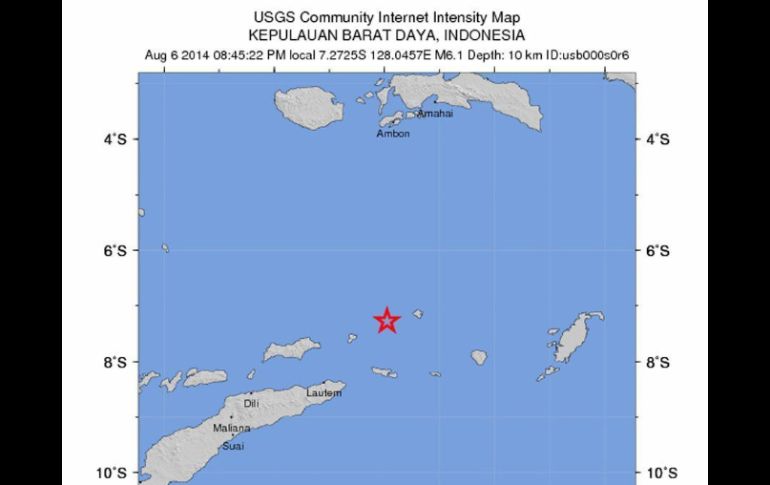 Internacional | Las autoridades no registran alerta de tsunami ni víctimas por el momento Un terremoto de 6.1 sacude el este de Indonesia Las autoridades no registran alerta de tsunami ni víctimas por el momento Por: EFE 6 de agosto de 2014 - 07:39 hs Imágen facilitada por El Servicio Geológico de Estados Unidos, que muestra el epicentro del movimiento telúrico. EFE / BANGKOK, TAILANDIA (06/AGO/2014).- Un terremoto de magnitud 6.1 grados sacudió el este de Indonesia, sin que las autoridades hayan declarado alerta de tsunami o informado de víctimas por el momento. El Servicio Geológico de Estados Unidos, que registra la actividad sísmica en todo el mundo, localizó el hipocentro a 10 kilómetros de profundidad marina y a 307 kilómetros al este noreste de Dili, la capital de Timor Oriental. El 26 de diciembre del 2004, un maremoto causó un tsunami que sembró la destrucción en una docena de naciones bañadas por el Océano Índico y causó más de 226 mil muertos. Indonesia se asienta sobre el llamado "Anillo de Fuego del Pacífico", un área de gran actividad sísmica y volcánica sacudida por unos siete mil temblores al año, la mayoría moderados. Temas Asia Sismos Indonesia Lee También Terremoto de magnitud 7.6 sacude el sur de Filipinas Sismos afectan nuevamente el sur del país esta madrugada Varios sismos de magnitud moderada se registraron en el sur del país Se registra sismo en Puerto Vallarta este 3 de octubre Recibe las últimas noticias en tu e-mail Todo lo que necesitas saber para comenzar tu día Registrarse implica aceptar los Términos y Condiciones