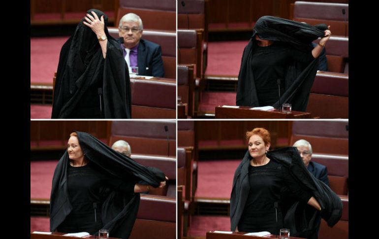 SÍDNEY, AUSTRALIA (17/AGO/2017).- La senadora australiana Pauline Hanson, líder del partido ultraconservador Una Nación, acudió hoy al Parlamento de Camberra ataviada con un burka como parte de su campaña contra esta prenda de las mujeres musulmanas.La política permaneció en su escaño cubierta por el velo negro durante unos 20 minutos, antes de tomar la palabra y quitárselo para pedir que sea prohibido por razones de seguridad."Si una persona debe quitarse un pasamontañas o un casco antes de entrar en un banco o cualquier otro edificio, incluido un tribunal. ¿Por qué no sucede los mismo con alguien que tiene la cara cubierta y no se puede identificar?", denunció Hanson.El fiscal general, George Brandis, reprendió en su turno de palabra el espectáculo de la política de Una Nación, agrupación que cuenta con otros tres asientos en la Cámara."Les advierto y les aconsejo que tengan mucho cuidado con ofender las sensibilidades religiosas de los australianos", en referencia a las leyes contra la discriminación racial y protección de libertad religiosa, dijo Brandis al cifrar en medio millón los australianos musulmanes, entre los aplausos del resto de miembros del Legislativo.