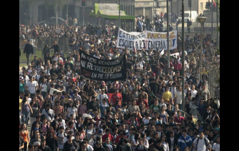 Internacional | Encapuchados irrumpen Vuelven estudiantes de Chile a la calle Los universitarios regresan a las marchas para exigir educación gratuita al Gobierno Por: EL INFORMADOR 15 de septiembre de 2011 - 02:55 hs SANTIAGO DE CHILE (15/SEP/2011).- El movimiento estudiantil chileno reanudó sus marchas multitudinarias para presionar al Gobierno por garantías antes de sentarse a dialogar en torno a sus demandas de educación de calidad, igualitaria y gratuita. Hubieron algunos incidentes en la protesta. Unos seis mil jóvenes, según la Policía, y 30 mil, de acuerdo a los organizadores, marcharon desde una universidad hasta una plaza cercana al centro de la ciudad. La caminata concluyó con un acto cultural. No obstante, cuando el acto prácticamente había concluido y quedaban unos mil jóvenes en la plaza, un grupo de encapuchados se apostó tras las rejas de una sede universitaria cercana y atacó con proyectiles a la Policía, que respondió con chorros de agua y gases lacrimógenos. Aunque los universitarios y un cuarto de millón de secundarios aseguran que no abandonarán las movilizaciones, por primera vez y debido a presiones económicas, se abrieron a la posibilidad de retornar a clases. Los universitarios exigen al Gobierno del presidente Sebastián Piñera varias garantías antes de iniciar un diálogo: que no se entreguen recursos a las universidades que lucran con dineros fiscales y que se anule el plazo del 7 de octubre para cerrar el semestre académico. “No hay diálogo con esa presión”, sostuvo la vocera universitaria Camila Vallejo antes del inicio de la marcha, mientras el secretario general de los estudiantes de la Universidad de Chile, Cristóbal Lagos, aseguró que el plazo fue inventado por las autoridades. La educación chilena es una de las más desiguales del mundo y su financiamiento está radicado en 85% en las familias, según el último estudio difundido por la Organización para la Cooperación y Desarrollo Económico (OCDE) Localizan restos humanos y de fuselaje tras avionazo Nuevos restos de las 21 víctimas del avión accidentado cerca de la isla Robinson Crusoe fueron hallados, así como partes del fuselaje, confirmó el ministro de Defensa, Andrés Allamand. Un equipo de buzos localizó a unos 50 metros de profundidad “restos de personas” y “parte significativa del fuselaje del avión”, ubicados en la misma zona en que fueron hallados los últimos restos, frente al archipiélago chileno. Temas América Latina Chile Manifestaciones en el mundo Lee También Chivas viaja con ‘Chicharito’ y Robinho al amistoso ante América en Estados Unidos Estas son las bajas de Chivas para el próximo Clásico Nacional Chivas y América calientan en redes el Clásico Nacional de la Fecha FIFA Sociales: El Informador inicia una nueva etapa con la moderna imprenta "Doña Stella" Recibe las últimas noticias en tu e-mail Todo lo que necesitas saber para comenzar tu día Registrarse implica aceptar los Términos y Condiciones