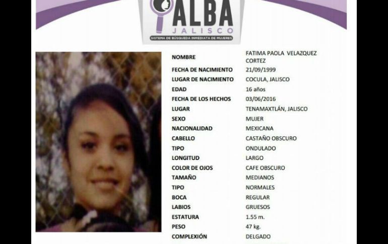 Jalisco | Buscan a Fátima Paola Velázquez de 16 años Activan Protocolo Alba Jalisco por joven de Cocula Buscan a Fátima Paola Velázquez de 16 años Por: EL INFORMADOR 9 de junio de 2016 - 21:06 hs De acuerdo con la ficha, la última vez que se supo de Fátima iba acompañada de su pareja. TWITTER / @ProtocoloAlba GUADALAJARA, JALISCO (09/JUN/2016).- Este jueves autoridades activaron el Protocolo Alba Jalisco para buscar a Fátima Paola Velázquez Cortez, de 16 años, quien desapareció el pasado 3 de junio. De acuerdo con la ficha difundida en redes sociales, la última vez que se le vio fue en el poblado de Tenamaxtlán, Jalisco, e iba acompañada de su pareja Sergio Natividad Zepeda. Para cualquier información que pueda ayudar a localizarla, favor de comunicarse al 066 Temas Municipios Violencia contra las mujeres Desapariciones en Jalisco Lee También Muere conductor tras choque entre camioneta y camión en Arandas Suben termómetros en Guadalajara y se espanta la lluvia este martes Abre centro de acopio del DIF para afectados por lluvias en Puerto Vallarta Hay más de mil viviendas afectadas por lluvias en Puerto Vallarta: Protección Civil Recibe las últimas noticias en tu e-mail Todo lo que necesitas saber para comenzar tu día Registrarse implica aceptar los Términos y Condiciones