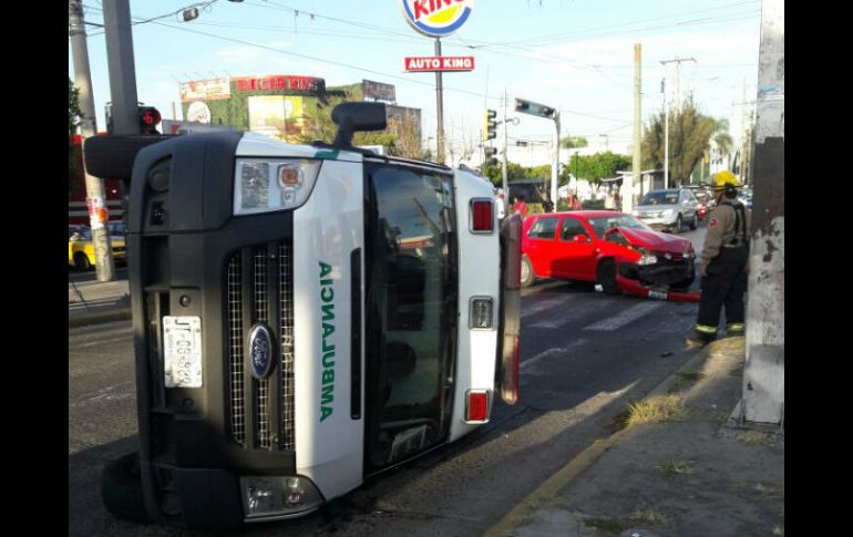 GUADALAJARA, JALISCO (06/DIC/2016).- Una ambulancia del IMSS volcó la mañana de este martes, en la Calzada Independencia, informaron Bomberos de Guadalajara.Esto sucedió luego de que un automóvil color rojo, tipo sedán impactara contra la unidad, reportaron medios locales.Elementos de la corporación acudieron hasta el cruce con la avenida Circunvalación para atender el percance.La volcadura de la unidad ocasionó el derrame de hidrocarburo del tanque, sin embargo, personal de bomberos municipales controló la situación.Hasta el momento, no se reportan personas lesionadas.