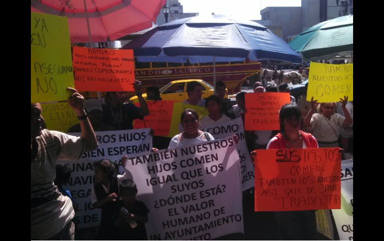 Jalisco | Alrededor de 40 personas protestan frente a la Presidencia Municipal de Guadalajara Ambulantes de la zona Centro piden que los dejen trabajar Alrededor de 40 personas protestan frente a la Presidencia Municipal de Guadalajara Por: EL INFORMADOR 11 de noviembre de 2013 - 13:23 hs Los comerciantes muestran su inconformidad frente a la presidencia. / GUADALAJARA, JALISCO (11/NOV/2013).- Alrededor de 40 personas protestan en las afueras de la Presidencia Municipal de Guadalajara. Son comerciantes ambulantes que se instalaban en el Centro Histórico y que denuncian satanizaciones y ataques de parte la Policía de Guadalajara. "Nos sentimos satanizados y atacados por la fuerza pública, nos ha golpeteado mucho. La Dirección de Inspección y Vigilancia no hace su trabajo, lo hace el policía", reclama Marco Antonio Santos Amador, presidente de la asociación civil de Comerciantes Ambulantes de la Zona Centro de Guadalajara. "Estamos hartos, si no puede el inspector con su trabajo, que lo dejé", declara el comerciante a nombre de las 485 personas que conforman la unión de ambulantes. Los manifestantes se encuentran en la banqueta de la calle Hidalgo, y aseguran que es una protesta pacífica. "Sólo pedimos trabajar en las áreas anteriores". Los ambulantes se ubicaban en la calle Santa Mónica-Galeana de Hidalgo a Juárez, en la Plaza Tapatía, en el jardín San Francisco, sobre Pedro Moreno de Ramón Corona a la Calzada Independencia, en Plaza Fundadores, y en la explanada del Instituto Cultural Cabañas. Ahora, dice que "nos mandaron a morirnos de hambre (...) Me da vergüenza que una de mis hijas me diga que la regañaron en la escuela porque no llevó un lápiz". En caso de no obtener respuesta de parte del Ayuntamiento de Guadalajara. EL INFORMADOR / SAÚL PRIETO Temas Manifestaciones en Jalisco Ayuntamiento de Guadalajara Comercio ambulante Lee También Protección Civil reabre el malecón de Puerto Vallarta Detienen a asesino de joven en partido de futbol ¿Cuál era la relación entre el barco pirata hundido en Vallarta y Colón? Así estará Guadalajara por la tarde; ¿lloverá? Recibe las últimas noticias en tu e-mail Todo lo que necesitas saber para comenzar tu día Registrarse implica aceptar los Términos y Condiciones
