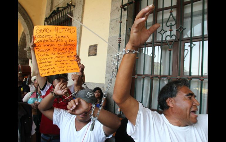 Jalisco | Amenazan con seguir e irse a huelga de hambre si no los dejan trabajar Ambulantes se encadenan afuera del Ayuntamiento Amenazan con seguir e irse a huelga de hambre si alcalde de Guadalajara no los deja trabajar Por: EL INFORMADOR 9 de noviembre de 2015 - 13:36 hs Los vendedores desechan cualquier propuesta para vender otros productos. EL INFORMADOR / R. Tamayo GUADALAJARA, JALISCO (09/NOV/2015).- Para exigirle al alcalde de Guadalajara, Enrique Alfaro que los deje trabajar, un grupo de 11 comerciantes de animales y artesanos se encadenaron a las afueras del Ayuntamiento y amenazaron con permanecer en el lugar e irse a huelga de hambre. Sandra Espinoza, líder de los artesanos y quien ya se había encadenado afuera del edificio cuando estaba embarazada, rechazó la propuesta de Alfaro de reubicarlos y de instalar kioscos. "Lo que nosotros queremos es que nos dejen trabajar", indicó al ser cuestionada sobre una propuesta para regular el comercio ambulante y también rechazó los empleos de la bolsa de trabajo al argumentar que el sueldo no le alcanzaría para mantener a sus hijos. Sandra indicó que el nuevo reglamento no va a permitir a todos los artesanos trabajar pues excluye la venta de pipas y bisutería. "Algunos de nosotros fabricamos nuestros productos pero a veces no se venden rápido y tenemos que comprar otras cosas para mantenernos. Ahora ya no vamos a poder", señaló al asegurar que no se retirarían del lugar hasta que se cumplieran sus demandas y hasta que todos su compañeros tengan un trabajo asegurado. Entre los manifestantes encadenados también se encontraban vendedores de aves y cachorros del Baratillo. Temas Manifestaciones en Jalisco Ayuntamiento de Guadalajara Municipios Centro Histórico Comercio ambulante Lee También Pablo Lemus y diputados mantienen diálogo sobre la reforma judicial Clima en Guadalajara hoy: el pronóstico para el miércoles 15 de octubre de 2025 Bosque de maple en Jalisco, el otoño más espectacular de México está aquí Jesse & Joy regresan a Guadalajara con El Despecho Tour Recibe las últimas noticias en tu e-mail Todo lo que necesitas saber para comenzar tu día Registrarse implica aceptar los Términos y Condiciones