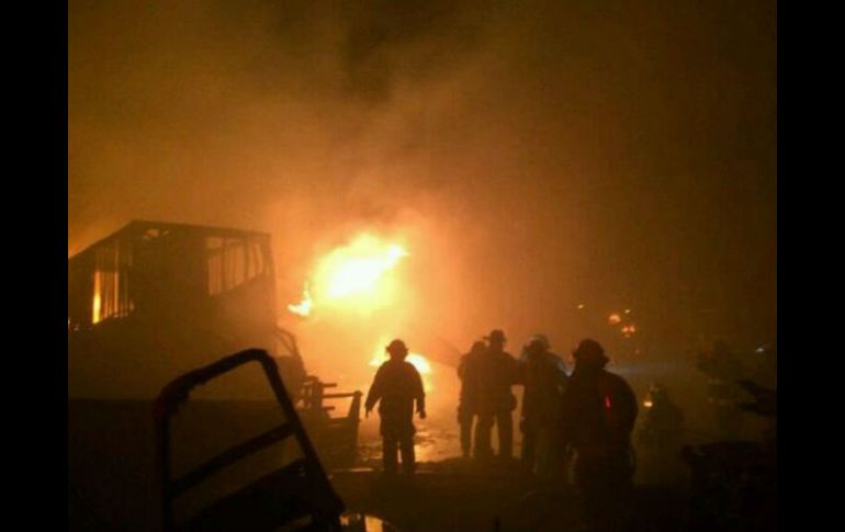 Jalisco | Protección Civil reporta cuatro camiones quemados en lote en Camino Real a Colima Aparatoso incendio en lote de camiones en Tlaquepaque Protección Civil reporta cuatro camiones quemados dentro de lote en Camino Real a Colima Por: EL INFORMADOR 11 de abril de 2014 - 21:08 hs Bomberos lograron el fuego. Imagen de @UMPCyBZ. ESPECIAL / TLAQUEPAQUE, JALISCO (11/ABR/2014).- Elementos de Protección Civil de Jalisco y Bomberos de Tlaquepaque buscan contener un aparatoso incendio ubicado en el cruce de Camino Real a Colima y la calle Bahía de Todos los Santos. La autoridad municipal reporta que van cuatro camiones quemados. El incendio inició al filo de las 21 horas en una pipa con capacidad de 30 mil litros, aún se desconoce si contenía diesel o combustolio. No se reportan heridos ni muertos provocados por el fuego, que se pudo observar desde el Periférico. Es una pensión que concentra decenas de autos, camiones y cajas de carga. El fuego ya está controlado, los bomberos trabajan para extinguirlo por completo. Temas Seguridad Incendios Bomberos Recibe las últimas noticias en tu e-mail Todo lo que necesitas saber para comenzar tu día Registrarse implica aceptar los Términos y Condiciones