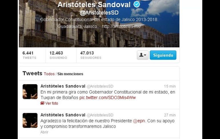 Jalisco | De todas las menciones que le han hecho, sólo ha respondido al mensaje de Peña Nieto Aristóteles agradece felicitación tuitera del Presidente De entre todas las menciones que le han hecho, hasta ahora el gobernador sólo ha respondido el mensaje de Peña Nieto Por: EL INFORMADOR 1 de marzo de 2013 - 16:43 hs Imagen del mensaje que publicó el gobernador entrante en su cuenta de Twitter. ESPECIAL / GUADALAJARA, JALISCO (01/MAR/2013).- Pese a las múltiples menciones que durante las últimas horas se han hecho a la cuenta del nuevo gobernador de Jalisco, Aristóteles Sandoval (@AristotelesSD), fue la referencia hecha por el Presidente Enrique Peña Nieto, la única que el jalisciense ha respondido hasta el momento. "Agradezco la felicitación de nuestro Presidente @epn. Con su apoyo y compromiso transformaremos Jalisco", publicó el gobernador entrante en su cuenta de Twitter. Casi dos horas antes, Peña Nieto hizo lo propio usando la misma red social. "Trabajaremos en conjunto por el bienestar de Jalisco", manifestó el mandatario federal. Otros personajes que han enviado tuits a Aristóteles Sandoval, y que hasta ahora no han obtenido respuesta, son el secretario de Desarrollo Agrario, Jorge Carlos Ramírez Marín (@jc_ramirezmarin), quien, por cierto, visitó Guadalajara en representación del Presidente; el titular de la Comisión Nacional del Agua David Korenfeld (@David_Korenfeld); la secretaria General del Consejo Ejecutivo Nacional del PRI, Ivonne Ortega (@IvonneOP), algunos de los 29 gobernadores invitados al discurso en el Instituto Cabañas y los alcaldes de la Zona Metropolitana de Guadalajara. EL INFORMADOR / SERGIO RODRÍGUEZ Temas Gobierno del Estado Enrique Peña Nieto Aristóteles Sandoval EL TEMA INFORMADOR Toma de protesta Lee También Cobro de impuestos saca a flote al Gobierno federal Claudia Sheinbaum supervisa las zonas más afectadas en Veracruz Reaparece Andy López tras su última polémica Tras pacto con Coca Cola, México acuerda bajar impuestos a refrescos Recibe las últimas noticias en tu e-mail Todo lo que necesitas saber para comenzar tu día Registrarse implica aceptar los Términos y Condiciones