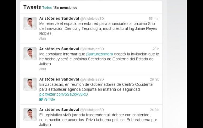 Jalisco | El gobernador electo anuncia por Twitter que Jaime Reyes Robles ocupará el cargo Aristóteles anuncia nuevo secretario de ciencia y tecnología El gobernador electo anuncia por Twitter que el Ing. Jaime Reyes Robles ocupará el cargo Por: EL INFORMADOR 28 de febrero de 2013 - 16:14 hs Reyes Robles se suma a Arturo Zamora como nuevo miembro del gabinete. ESPECIAL / GUADALAJARA, JALISCO (28/FEB/2012).- El Gobernador electo del estado de Jalisco, Aristóteles Sandoval, anunció mediante su cuenta de Twitter a un nuevo integrante de su gabinete. Se trata del nuevo Secretario de Innovación,Ciencia y Tecnología, el ingeniero Jaime Reyes Robles. ''@AristotelesSD: Me reservé el espacio en esta red para anunciarles al próximo Srio de Innovación,Ciencia y Tecnología, mucho éxito al Ing Jaime Reyes Robles''. Reyes Robles se suma a Arturo Zamora como nuevo miembro del gabinete, quien también fue anunciado mediante esta red social. Se tiene previsto que el resto de los integrantes del nuevo gabinete de Aristóteles Sandoval sea anunciado hoy a las 18:00 horas (una hora después de lo previsto) desde el salón Country del hotel Fiesta Americana Grand. EL INFORMADOR / ALEJANDRA GALLARDO Temas Gobierno del Estado PRI Jalisco Aristóteles Sandoval Lee También Charros de Jalisco arranca temporada de LMP con derrota ante los Águilas Se incendian dos vehículos en Teocaltiche; investigan los hechos Dónde ver EN VIVO Charros de Jalisco vs Águilas de Mexicali por la serie inaugural de la LMP Ratifican a Consuelo González como magistrada del Supremo Tribunal de Justicia de Jalisco Recibe las últimas noticias en tu e-mail Todo lo que necesitas saber para comenzar tu día Registrarse implica aceptar los Términos y Condiciones