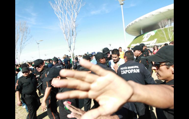 Jalisco | Tras peleas entre porras, Policía Municipal informó que hubo detenidos y lesionados Arrestan a 25 seguidores del Guadalajara por desmanes Policía Municipal informó que 25 seguidores de Chivas fueron detenidos tras peleas entre porras antes de partido de futbol en el Omnilife Por: EL INFORMADOR 25 de febrero de 2013 - 10:26 hs La Policía Municipal durante las detenciones el día de ayer en el Omnilife. / ZAPOPAN, JALISCO (25/FEB/2013).- Tras las peleas campales entre miembros de la porras de los equipos del Guadalajara y del León, fueron arrestadas 25 personas y otras 10 resultaron heridos. Una de las peleas más fuertes se registró en Periférico y avenida del Bosque la noche del domingo, donde un camión que transportaba a seguidores de los "panza verdes", fue atacado a pedradas, resultando heridos al menos 10 de los tripulantes, quienes fueron atendidos por paramédicos de la Cruz Verde Municipal y Bomberos. Una de las personas más delicadas resultó ser el chofer, debido a que fragmentos del parabrisas le estrellaron casi en el rostro debido a las pedradas que recibió. "Primero, no nos dejaron acercarnos a las taquillas del Estadio Omnilife para comprar los boletos; después nos juntaron en una zona, en la que ni podíamos salir y ni entrar, y después, la peleas campales", mencionó un aficionado del equipo León, quien dijo ser Arturo Mondragón Por su parte, la Policía Municipal informó que fueron detenidos 25 seguidores del equipo Guadalajara y puestos a disposición de un Juzgado Municipal por actos de vandalismo, y alteración al orden público, pero al pagar una multa, salieron libres. Sin embargo, la Policía Municipal, no consignó a los detenidos ante la Procuraduría General de Justicia del Estado, ya que ninguna una persona afectada se presentó para señalar algún daño o lesión. Temas Seguridad Chivas Detenidos en Jalisco Recibe las últimas noticias en tu e-mail Todo lo que necesitas saber para comenzar tu día Registrarse implica aceptar los Términos y Condiciones