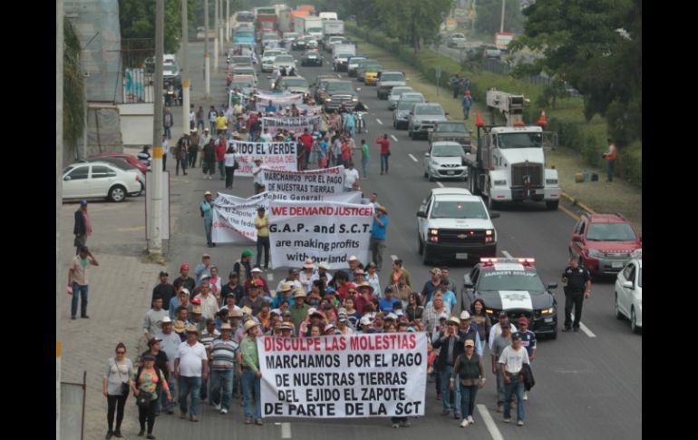GUADALAJARA, JALISCO (19/OCT/2016).- Poco después de las 10 de la mañana inició la marcha de ejidatarios de El Zapote acompañados de integrantes de ejidos como el de Zapotlanejo, Buenavista, San Miguel Cuyutlán.Los manifestantes piden el pago de sus terrenos en la zona donde se ubica la central aérea tapatía.El contingente avanzó por la Carretera Chapala, a partir de la Plaza ''El 13'', con destino al aeropuerto tapatío.El recorrido lo realizan por un carril lateral de Carretera a Chapala y el acotamiento. Algunos vehículos que acompañan al contingente avanzan por un segundo carril, por lo que dejan solamente uno totalmente libre a la circulación.Detrás del grupo de manifestantes está congestionada la circulación en Carretera a Chapala, en carriles de salida de la metrópoli, rumbo al aeropuerto.Minutos antes de las 13:00 horas, los manifestantes ingresaron a la vialidad que conduce al aeropueto y abandonaron la Carretera a Chapala.Por su parte, los pasajeros tuvieron que caminar para arribar y dejar la terminal debido al congestionamiento vehicular.Debido a esta movilización, unas 50 personas esperan un taxi en el aeropuerto y el servicio de Uber no se encuestra disponible.EL INFORMADOR / LETICIA FONSECA