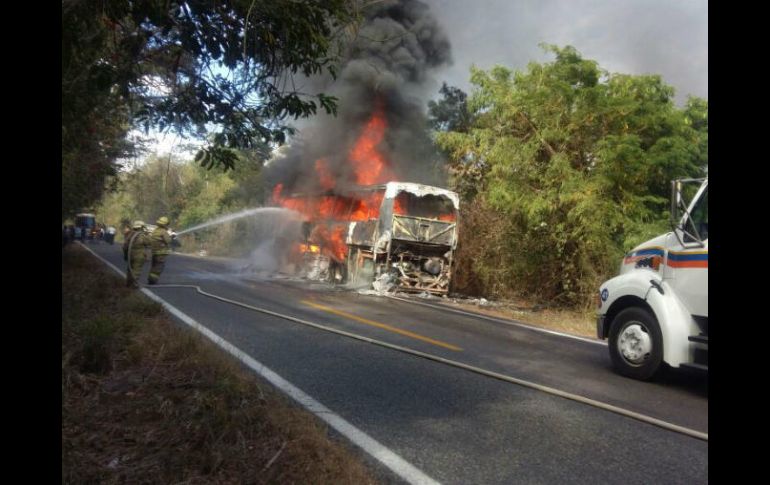 GUADALAJARA, JALISCO (31/ENE/2017).- El fuego destruyó un autobús de pasajeros que sufrió un incendio por un aparente cortocircuito en pleno viaje, en la carretera federal 80, rumbo a Cihuatlán, Jalisco.El incidente ocurrió esta tarde, a la altura del kilómetro 241 de esa vía, dentro del municipio de Cihuatlán, informó la Unidad Estatal de Protección Civil.El propio conductor del autobús que cubría la ruta Guadalajara-Melaque notó el problema, detuvo el vehículo y decidió que la gente bajara del camión, que luego terminó de incendiarse. Nadie resultó lesionado, según Protección Civil.