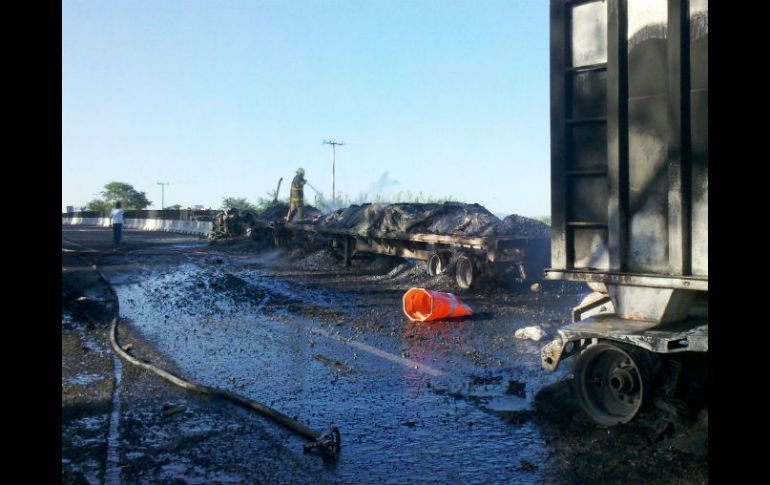 Jalisco | Tras el impacto, tres personas resultaron lesionadas Automotores de carga protagonizan accidente carretero Debido al choque entre ambos automotores, se produjo un incendio que calcinó la carga que transportaban los vehículos Por: EL INFORMADOR 4 de octubre de 2012 - 09:00 hs Elementos de la UEPCBJ y de Tuxpan apagaron el fuego de ambos vehículoy realizaron las tareas de limpieza. ESPECIAL / TUXPAN, JALISCO (04/OCT/2012).- Dos camiones quedaron destruidos y calcinados tras haberse impacto de frente en la autopista que conduce de Jalisco a Colima dentro del municipio de Tuxpan. Tres personas resultaron con heridas por el percance, además la vía quedó cerrada por un espacio de dos horas. Elementos de una Unidad Estatal de Protección Civil y Bomberos de Jalisco, (UEPCBJ) y de la Unidad de Bomberos Municipal de Tuxpan, acudieron a las 17:00 horas de este miércoles, a la citada vía a la altura del kilómetro 103, donde encontraron dos camiones de carga estrellados de frente e incendiados. Se presume que los protagonistas del choque carretero fueron un tráiler Kenworth, con placas 857-AL3, que cargaba un mineral, y un camión Dina, con la matricula 294-AG8 que transportaba plástico que sería llevado a reciclar. Las autoridades municipales explicaron que el tráiler circulaban con destino a la Zona Metropolitana de Guadalajara y el camión con destino al estado de Colima, cuando alguno de los dos, invadió los carriles contrarios y se produjo el accidente. Por el impacto, los automotores se quemaron junto con la carga que transportaban. Una de las personas heridas fue identificada como Vicente Espinoza Hernández, de 30 años de edad, vecino de San Luis Potosí, y otros dos hombres no reconocidos fueron llevados por técnicos en emergencias al Hospital Regional de Ciudad Guzmán para recibir atención. Elementos de la UEPCBJ y de Tuxpan apagaron el fuego de ambos automotores y realizaron las tareas de limpieza. Por su parte, elementos de la Policía Federal división Caminos atendieron el siniestro para liberar la vía. Temas Seguridad Accidentes Protección Civil Jalisco Recibe las últimas noticias en tu e-mail Todo lo que necesitas saber para comenzar tu día Registrarse implica aceptar los Términos y Condiciones