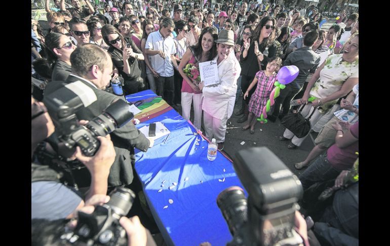 Jalisco | Colectivos ciudadanos llaman a aceptar pluralidad en Jalisco Bodas simbólicas para la diversidad Convocan a ceremonia grupal en la Plaza Liberación a través de redes sociales e internet Por: EL INFORMADOR 11 de febrero de 2013 - 02:59 hs GUADALAJARA, JALISCO (11/FEB/2013).- Parejas de hombres, de mujeres y de hombres y mujeres celebraron bodas simbólicas ayer en Plaza Liberación para visibilizar la diversidad sexual, a menos de una semana del Día del Amor. Frente a un joven que hacía las veces de juez de Registro Civil, los novios y novias fueron pasando a juramentar su amor. Firmaron un acta y se tomaron fotos; algunos hasta anillos llevaron y unas mujeres brindaron con copas. En el Congreso del Estado se han presentado iniciativas para regular las uniones civiles entre personas del mismo sexo, pero no han pasado del análisis de comisiones. Justo a un lado de la fuente frente al recinto que alberga el Poder Legislativo fue que se registraron los casamientos, en torno a las 16:00 horas. La convocatoria de la boda colectiva fue difundida por redes sociales y organizaron la actividad colectivos como Lesbow Land, Lesbian World Guadalajara, Coleta y Lesbianas de Jalisco, entre otros. Lesbow Land creó un video que colgó a YouTube para invitar a las parejas a la boda colectiva. Temas Municipios Plaza Liberación Matrimonio homosexual Recibe las últimas noticias en tu e-mail Todo lo que necesitas saber para comenzar tu día Registrarse implica aceptar los Términos y Condiciones