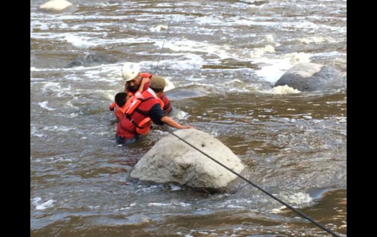 Jalisco | Dos adultos y un niño quedaron varados ante la crecida del Santiago Bomberos de Zapopan rescatan a personas atrapadas en río Dos adultos y un niño quedaron varados ante la crecida del Santiago Por: EL INFORMADOR 26 de abril de 2014 - 23:08 hs Los rescatistas extendieron cuerdas a través del río para ayudar a cruzar a las personas. / GUADALAJARA, JALISCO (27/ABR/2014).- Dos adultos y un menor de edad fueron rescatados por personal de Protección Civil y Bomberos de Zapopan la tarde de ayer sábado cuando quedaron atrapados por la creciente del río Santiago al intentar cruzarlo. Hacia las cinco de la tarde se solicitó el apoyo de la dependencia que envió unidades al punto ubicado a la altura de la ex hacienda Del Lazo. Las personas atrapadas eran José Luis Carrillo Sierra, de 36 años; Miguel Carlos Benavides, de 25 años; y Álvaro, de ocho años. Ellos habían cruzado el río a cortar guamúchiles pero al intentar regresar se encontraron con que el caudal del río había aumentado. Bomberos de Zapopan y autoridades estatales lograron cruzar el río con cuerdas y rescatar a las personas atrapadas. AGENCIA INFORMADOR Temas Seguridad Protección Civil Jalisco Bomberos de Zapopan Río Santiago Recibe las últimas noticias en tu e-mail Todo lo que necesitas saber para comenzar tu día Registrarse implica aceptar los Términos y Condiciones