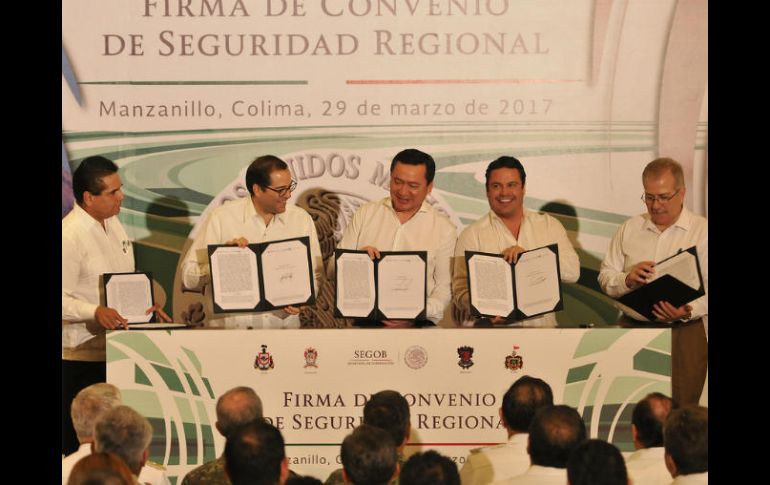 MANZANILLO, COLIMA (29/MAR/2017).- En conjunto con autoridades de Colima, Michoacán y Guanajuato, el gobernador de Jalisco, Aristóteles Sandoval Díaz, junto con el secretario de gobernación, Miguel Ángel Osorio Chong, firmó el Convenio de Seguridad Regional, una iniciativa que tiene como fin instrumentar en coordinación estrategias de seguridad públicas para aplicarlas en áreas limítrofes de las entidades.Durante esta firma, el gobernador reiteró su reconocimiento hacia las labores del Ejército Mexicano en cuestiones de seguridad y convocó a diputados federales a aprobar, a la brevedad, la Ley de Seguridad Interior, en defensa de las Fuerzas Armadas y la protección legal de los servidores castrenses."Tengan la seguridad de que desde cada región del país sumaremos en una estrategia de seguridad nacional, que está centrada, primero, en que cada mexicano ejerza todos sus derechos", puntualizó Sandoval Díaz.El mandatario estatal refirió que este convenio permitirá intercambiar información, definir acciones y dar un seguimiento a los acuerdos a través de los grupos de coordinación de cada uno de los estados participantes.Además, el gobernador pidió al secretario de Gobernación mayores apoyos para continuar el trabajo de prevención en distintas colonias del Estado y de la Zona Metropolitana de Guadalajara.A su vez, Osorio Chong resaltó que pese a los retos en materia de seguridad en Jalisco, se notan avances."Hoy hay una diferencia enorme entre lo que encontramos y lo que hoy estamos percibiendo, también tenemos que seguir adelante, pero se nota la mano, se nota la decisión y ahí el gobernador conduciendo siempre en los grupos de coordinación todo el esfuerzo por la tranquilidad de la gente del Estado de Jalisco", sostuvo.