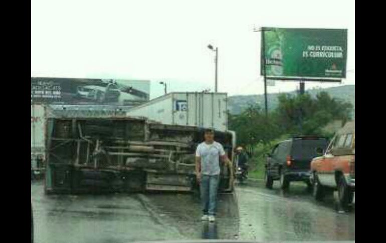 Jalisco | El conductor pierde el control y el vehículo cae sobre su costado derecho Camión vuelca sobre Periférico Sur El conductor pierde el control y el vehículo cae sobre su costado derecho Por: EL INFORMADOR 22 de junio de 2013 - 16:44 hs Debido a la obstrucción se registra fuerte carga vehicular en la zona. / GUADALAJARA, JALISCO (22/JUN/2013).- La tarde de este sábado volcó un camión de carga sobre el Periférico Sur, en los carriles en dirección oriente, a la altura de Juan de la Barrera. Los hechos ocurrieron a las 15:25 horas, que el conductor perdió el control y cayó sobre su costado derecho. No obstante lo aparatoso del percance, el accidente no dejó lesionados, según Protección Civil y Bomberos de Tlaquepaque, que fue la dependencia que atendió el servicio. Debido a que el camión obstruye dos carriles se registra fuerte carga vehicular en la zona, por lo que se recomiendan rutas alternas. Temas Seguridad Accidentes Periférico Lee También Omar 'N' es vinculado a proceso por presunto abuso sexual infantil agravado Detienen a hombre señalado por abusar sexualmente de su hija Policías de Tlaquepaque aseguran contenedores con carga millonaria Detienen a una mujer en Zapopan tras presuntamente robar un Costco Recibe las últimas noticias en tu e-mail Todo lo que necesitas saber para comenzar tu día Registrarse implica aceptar los Términos y Condiciones