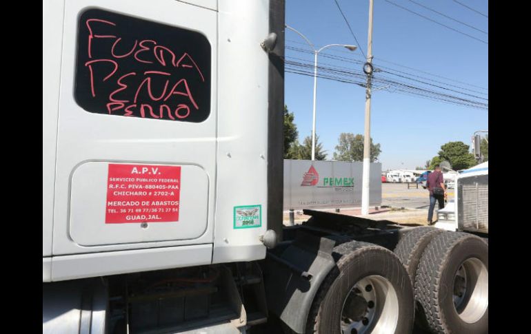 GUADALAJARA, JALISCO (04/ENE/2017).- Alrededor de 50 camiones de carga pesada bloquean las laterales Avenida Aviación frente al ingreso principal del Centro de Distribución de Pemex, en Zapopan.Se trata de góndolas, gruas y trailers que intesamente suenan sus claxon y muestran su inconformidad por el alza al precio de la gasolina.Los transportistas, pertenecientes a la Confederación Nacional de Transportistas Mexicanos (Conatram), informaron que permanecerán en plantón por tiempo indefinido.Diego Javier Bolio Corona, líder de los camioneros, informó que la salida del combustible se está permitiendo por el acceso trasero de la planta de Pemex, por lo que señaló que su movilización se llevará a cabo de manera pacífica."Hay otra salida, realmente este movimiento es simbólico. Por atrás siguen saliendo las pipas, no queremos contribuir en el desabasto". Bolio Corona añadió que a lo largo del día se sumarán más unidades.El líder de la Conatram señaló que se debe dar marcha atras al incremento del combustible, ya que los costos de traslado de las unidades que representan se dispararán en un 20 por ciento."Vamos a tener que subir el precio y los clientes son los que la van a tener que pagar, además de que va a repercutir en el precio final de todos los productos".Al momento, los camiones de carga pesada que transitan por la zona con cemento, refrescos y grúas se solidarizan con el movimiento sonando sus claxon en señal de apoyo.Además, se unió un grupo de 25 motociclistas en contra del Gasolinazo.La movilización no afecta el flujo de tráfico en la zona.EL INFORMADOR / FABIOLA HERNÁNDEZ