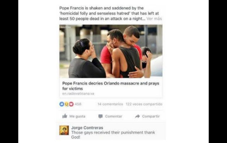 Jalisco | ''Esos gays recibieron su castigo, gracias Dios'', escribe Jorge Contreras en Facebook Cesan a otro por comentario homofóbico; ahora en Zapopan Su cargo estaba relacionado con la supervisión de los Derechos Humanos en el municipio Por: EL INFORMADOR 14 de junio de 2016 - 07:00 hs GUADALAJARA, JALISCO (14/JUN/2016).- El alcalde de Zapopan, Pablo Lemus Navarro informó que el director jurídico para los Derechos Humanos y Transparencia de la Sindicatura del Ayuntamiento fue separado de su cargo luego de emitiera comentarios homofóbicos, en redes sociales, en referencia a la matanza en un establecimiento gay de la ciudad estadounidense de Orlando que dejó 49 víctimas mortales, más el autor del tiroteo. Jorge Contreras publicó en Facebook que decía: "Those gays received their punishment thank God!'' (''Esos gays recibieron su castigo, gracias Dios''). El texto fue colocado como un comentario al margen de una nota de la radio vaticana sobre la tragedia del pasado 12 de junio en la que se informaba la condena que realizaba el Papa Francisco de la masacre y acerca de su oración por las víctimas. Luego de la filtración en redes sociales del dicho, Lemus Navarro informó ayer en su cuenta de Twitter que el funcionario, relacionado con la observación de los Derechos Humanos en el municipio de la ex Villa Maicera, había sido separado de su cargo. ''Creo firmemente que el primer paso para construir comunidad es el reconocimiento del valor de todas las personas y respeto a la diversidad. En Zapopan no vamos a tolerar actos de discriminación y mucho menos ante una tragedia como la que sucedió este fin de semana en Orlando'', escribió el munícipe en un breve comunicado de prensa. Y continuó afirmando que en Zapopan no se tolerarán actos de discriminación y, ''mucho menos, ante una tragedia como la que sucedió este fin de semana en Orlando''. Contreras percibió en la primera quincena de mayo un salario neto de 14 mil 387.43 pesos, por lo que se calcula que al mes recibía una gratificación por su trabajo que rondaba los 30 mil pesos libres. El mismo día del crimen de odio en Estados Unidos, otro funcionario público, pero del Gobierno del Estado de Jalisco fue cesado por emitir también comentarios ofensivos y discriminatorios sobre las personas con preferencias homosexuales y contra las víctimas morales de la masacre. Jesús Manzo Corona, quien era directivo de la Secretaría de Desarrollo Social de Jalisco (Sedis) publicó en su Facebook ''lástima que fueron 50 y no 100 (en relación al número de muertos)'', comentario que otros usuarios de redes sociales rechazaron enérgicamente. Cuatro mexicanos se encuentran entre los 49 fallecidos por la masacre en el club Pulse, un centro nocturno que frecuentaban homosexuales en Orlando, Florida, y un paisano más está entre las otras 53 personas que resultaron heridas. EL INFORMADOR / ÓSCAR ÁLVAREZ Temas Municipios Discriminación Racismo Pablo Lemus Homosexualidad Tiroteo en Orlando Lee También ¿Cuál era la relación entre el barco pirata hundido en Vallarta y Colón? No descartan episodios de lluvia dispersa este sábado en Guadalajara Bajan lluvias el sábado en Guadalajara, pero se mantiene nublado Con "Raymond" cerca, Guadalajara espera lluvias a esta hora del viernes Recibe las últimas noticias en tu e-mail Todo lo que necesitas saber para comenzar tu día Registrarse implica aceptar los Términos y Condiciones