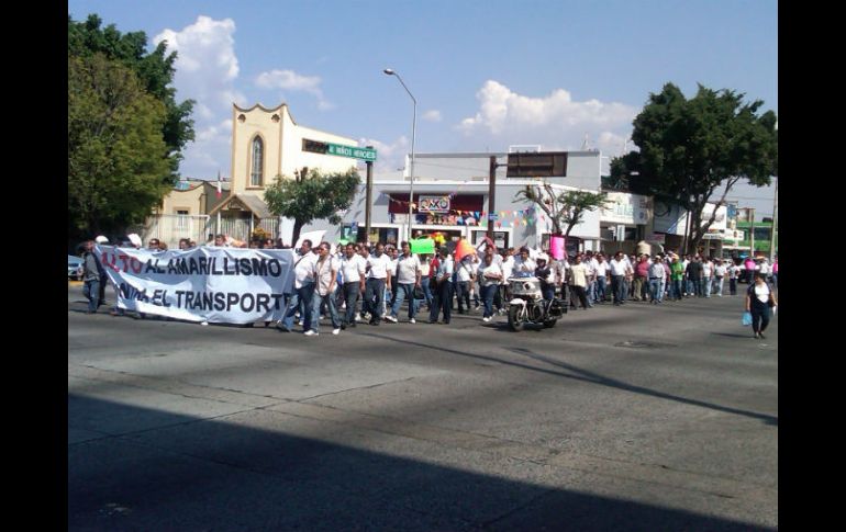 Jalisco | Avanzan por avenida 16 de septiembre hasta avenida Alemania Choferes marchan en pro del respeto y seguridad del gremio Avanzan por avenida 16 de septiembre, seguirán por Niños Héroes, después Enrique Díaz de León hasta avenida Alemania Por: EL INFORMADOR 19 de octubre de 2012 - 14:37 hs El contingente recorría pasadas las 14:00 horas avenida Niños Héroes. / GUADALAJARA, JALISCO (19/OCT/2012).- "Alto al amarillismo contra el transporte", demandan más de 200 choferes de distintas rutas a medios de comunicación, en la marcha que realizan por avenida 16 de Septiembre, por los tres carriles en el sentido Norte- Sur. Avanzan a partir de avenida La Paz, seguirán por Niños Héroes, Enrique Díaz de León, hasta avenida Alemania, enfrente de un medio de comunicación. En sus pancartas piden "soluciones no confrontaciones". Algunos de los manifestantes se cubrieron la boca con cinta adhesiva. El contingente recorría pasadas las 14:00 horas avenida Niños Héroes, sobre los tres carriles de Oriente a Poniente. Para saber El dirigente del Frente Unido de Subrogatarios y Concesionarios del Transporte Público, Juan Carlos Villarreal Salazar, había expresado el pasado 17 de octubre su preocupación por el clima de confrontación que se ha generado hacia el sector camionero y anunciado la marcha de este viernes. "Hay un ambiente de linchamiento, de confrontación, que en ocasiones se ha alimentado desde algunos medios de comunicación". La movilización también se da en medio de los hechos violentos de la semana pasada, en los que cinco empleados del transporte público fueron asesinados. Las autoridades analizan si las muertes tienen que ver con el número de víctimas mortales ocasionadas por el transporte público, delincuencia organizada o venganza ciudadana. EL INFORMADOR / LETICIA FONSECA Temas Manifestaciones en Jalisco Transporte Público Vialidad Recibe las últimas noticias en tu e-mail Todo lo que necesitas saber para comenzar tu día Registrarse implica aceptar los Términos y Condiciones