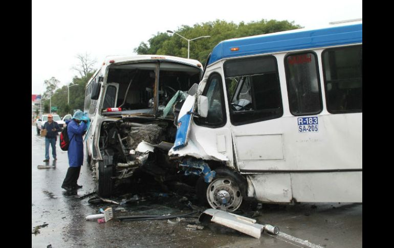 Jalisco | En distintos hechos, los accidentes han dejado dos muertos y más de 60 lesionados Choque de seis midibuses deja fallecidos y lesionados En distintos hechos, los accidentes han dejado dos muertos y más de 60 lesionados Por: EL INFORMADOR 23 de octubre de 2015 - 14:08 hs El más reciente, fue el choque de un midibús del transporte público de la ruta 183 contra un camión de transporte de personal. EL INFORMADOR / Especial GUADALAJARA, JALISCO (23/OCT/2015).- Seis unidades del transporte público han participado en distintos hechos entre este jueves y viernes lo que ha dejado un saldo de dos muertos y más de 60 lesionados, según informes de diversas autoridades. Los más recientes ocurrieron por la mañana de este viernes. Alrededor de las siete de la mañana chocó un midibús del transporte público de la ruta 183 contra un camión de transporte de personal sobre López Mateos y Ramón Corona, frente a Santa Anita. Se trató de un choque frontal que dejó un saldo de 27 personas lesionadas, 20 de las cuales se reportaron en estado leve y siete más en estado regular. Varias unidades de servicios médicos se trasladaron al lugar para atender a las personas. Poco después, sobre la carretera a Santa Fe en el crucero de las vías del ferrocarril dos unidades más del transporte público, las dos de la ruta 619, chocaron contra el tren en un hecho en el que resultaron afectados además un mototaxi y cuatro vehículos particulares. De este hecho quedaron 21 personas heridas, una de ellas grave. A las once de la mañana, una unidad de la ruta 171, número económico S-1670, se impactó contra un poste de luz en el cruce de González Gallo y Río Atotonilco, donde tres personas resultaron lesionadas. A las diez de la noche del jueves murió una persona más tras ser arrollada por una unidad del transporte público de la ruta 624 en el cruce de Mariano Otero y Periférico. La persona tripulaba una motocicleta cuando fue impactada por el camión. Y por la tarde del jueves, poco después de las cinco, un midibús más de la ruta 186 chocó contra un camión repartidor de leche sobre la carretera Tlajomulco-Santa Fe a la altura del Fraccionamiento Cima Real. En este hecho falleció prensado el conductor del camión de lácteos, Luis Carlos Zárate Ocampo, de 35 años, además de que 11 personas quedaron lesionadas. El chofer del transporte público escapó del lugar. Temas Seguridad Accidentes con muertes en Jalisco Muertes Lee También Esto costará el Gas LP en Jalisco en la semana del 13 al 18 de octubre Así se vive la Romería 2025 este domingo 12 de octubre (FOTOS) Elementos de seguridad detienen a traficante sueco en Cancún "La Virgen me salvó del cáncer de mama", agradecen la vida, salud y bienestar en la Romería 2025 Recibe las últimas noticias en tu e-mail Todo lo que necesitas saber para comenzar tu día Registrarse implica aceptar los Términos y Condiciones