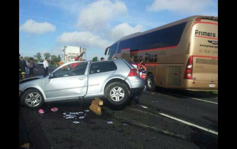 Jalisco | La colisión entre un camión de pasajeros y un auto se registró esta mañana Choque en carretera a Lagos de Moreno deja dos muertos La colisión entre un camión de pasajeros y un auto se registró esta mañana en la autopista a Jalostotitlán Por: EL INFORMADOR 7 de junio de 2014 - 21:07 hs Dos tripulantes del Golf perdieron la vida a acusa del impacto. ESPECIAL / GUADALAJARA, JALISCO (07/JUN/2014).- Una colisión ocurrida la mañana de este sábado en la autopista Lagos de Moreno-Jalostotitlán entre un camión de pasajeros de la empresa Primera Plus y un automóvil particular provocó la muerte de dos viajeros de este último vehículo, informó la base regional de San Juan de los Lagos de la Unidad Estatal de Protección Civil y Bomberos de Jalisco (UEPCBJ). Unidades acudieron hacia las diez de la mañana al kilómetro 64 de la autopista citada en la dirección hacia Guadalajara. El personal encontró en el punto un automóvil Golf plata, modelo 2001 con placas del Estado de México, el cual se había impactado en contra del autobús. Al revisar a los tripulantes del Golf encontraron sin vida a Aglay García Martínez, de 29 años, y a José Cruz García, de quien se desconoce su edad. La dependencia utilizó el aparato llamado "quijadas de la vida" para poder extraer los cuerpos de los fierros retorcidos del auto. En el sitio también se encontraban lesionadas leves Luis Antonio Garrido Parra, de 34 años; Cinthia García Martínez, de 32 años; y María Magdalena Martínez, de 61 años. En el autobús, número económico 6071, placas de circulación 069HY-2 del servicio público federal, viajaban 17 pasajeros que se dirigían de San Miguel el Alto a Guadalajara. Todas ellas resultaron ilesas mientras que el chofer se dio a la fuga. Las autoridades desconocen al momento los datos de éste. Al sitio arribó personal de la Policía Federal, de la Unidad Municipal de Protección Civil de Tepatitlán de Morelos, Bomberos de Jalostititlán, y la Cruz Roja Delegación Tepatitlán. Temas Seguridad Accidentes con muertes en Jalisco Protección Civil Jalisco Carreteras de Jalisco Lee También Cartucho Astros de Jalisco toma ventaja sobre Xalapa en la semifinal de zona Detienen a presunto homicida en Lomas de Oblatos Puerto Vallarta es reconocida como la mejor ciudad pequeña de Latinoamérica Recibe las últimas noticias en tu e-mail Todo lo que necesitas saber para comenzar tu día Registrarse implica aceptar los Términos y Condiciones