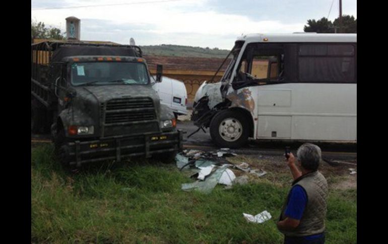 Jalisco | Hay ocho personas lesionadas. Las autoridades no detallan si civiles o militares Choque entre camioneta de personal y de militares en carretera a Nogales Hay ocho personas lesionadas. Las autoridades no detallaron si se trataba de los civiles o los militares Por: EL INFORMADOR 6 de julio de 2013 - 09:33 hs A través de su cuenta en Twitter, @eduardoaguayo4 comparte la imagen de los vehículos siniestrados. ESPECIAL / GUADALAJARA, JALISCO (06/JUL/2013).- La mañana de este sábado se comenzó a registrar intenso tráfico sobre la carretera a Nogales, a la altura de La Venta del Astillero, toda vez que se registró un choque entre una camioneta de transporte de personal con un camión militar. El accidente ocurrió alrededor de las 06:40 horas; la camioneta, de la empresa Jaguar, se impactó contra la unidad de los militares, lo que dejó como saldo cerca de ocho personas lesionadas. Las autoridades no detallaron si se trataba de los civiles o los militares. El incidente ha provocado un fuerte congestionamiento en la carretera. Temas Accidentes Vialidad Carreteras de Jalisco Recibe las últimas noticias en tu e-mail Todo lo que necesitas saber para comenzar tu día Registrarse implica aceptar los Términos y Condiciones