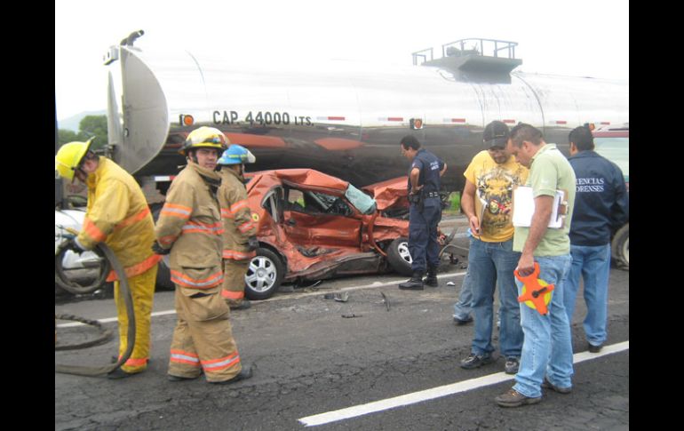 Jalisco | Autoridades del municipio de Tlajomulco continúan en la zona del accidente Choque entre tres vehículos deja saldo de un muerto Se registró el percance sobre la carretera referida a la altura del puente Las Cuatas Por: EL INFORMADOR 24 de junio de 2010 - 07:44 hs Un choque entre dos vehículos particulares y una pipa sobre la carretera a Morelia. O. RUVALCABA / TLAJOMULCO DE ZÚÑIGA, JALISCO (24/JUN/2010).- Esta mañana un choque entre dos vehículos particulares y una pipa sobre la carretera a Morelia dejó como saldo una persona de 59 años de edad fallecida. Alrededor de las 7:00 de la mañana se registró el percance sobre la carretera referida a la altura del puente Las Cuatas, donde participaron una camioneta Expedition color tinto con matricula JC 9318, un trailer tipo pipa y un automóvil Chevy color anaranjado con placas JSW 3913, de este último José de Jesús Hernández Barba, quien era el conductor falleció tras quedar prensado. Según testigos del accidente, éste ocurrió cuando Hernández Barba circulaba sobre la carretera en el sentido norte - sur y al tomar el retorno no lo hizo adecuadamente, por lo que el chofer de la camioneta color tinto no alcanzó a frenar impactándose con el Chevy para ambos terminar estrellados en el trailer. Los tripulantes de la Expedition, una mujer y un hombre, fueron atendidos por personal de servicios médicos municipales de Tlajomulco, reportando que el estado de salud de ambos era regular, sobre todo de la mujer, quien se encuentra embarazada. De acuerdo con la versión de los Policías Federales, el trailer con razón social Hert Tady S.A de C.V se encontraba debidamente estacionado sobre el acotamiento, por lo que no es participante del accidente. Elementos de bomberos del municipio se encargaron de rescatar el cadáver, por lo que personal de Servicios Médicos Forenses (Semefo) se encargó de trasportar el cuerpo al anfiteatro del nosocomio. Temas Seguridad Accidentes con muertes en Jalisco Policía de Tlajomulco Lee También Asesinan a balazos a una mujer en Tlaquepaque Por segundo día, incendian vehículos en Teocaltiche FGJ investiga cuál de los detenidos mató al abogado David Cohen Rescatan al "Flaco"; perro abandonado en un domicilio de El Salto Recibe las últimas noticias en tu e-mail Todo lo que necesitas saber para comenzar tu día Registrarse implica aceptar los Términos y Condiciones