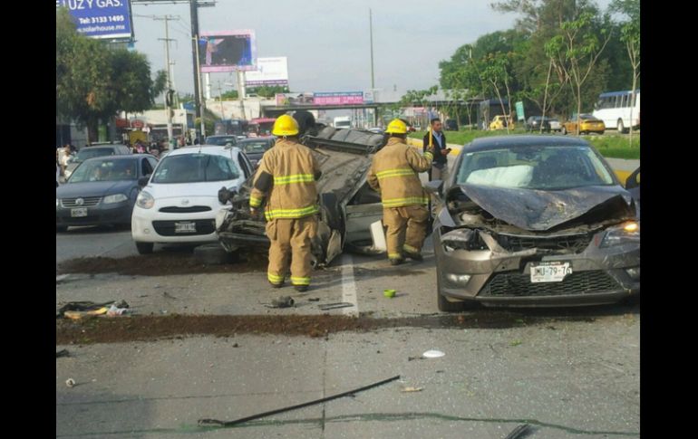 GUADALAJARA, JALISCO (24/AGO/2016).- Un choque en el que participaron cinco vehículos la mañana de este miércoles dejó un auto volcado y tres personas lesionadas, entre ellas, una mujer en estado de gestación, informó Bomberos Zapopan.Poco antes de las nueve de la mañana acudieron unidades de rescate a avenida López Mateos, a la altura de Bugambilias en los carriles que van de sur a norte. En el sitio había cinco autos que obstruían al menos tres carriles.Los lesionados fueron trasladados a la Cruz Verde Las Águilas en estado regular. Las autoridades procedieron al retiro de los vehículos a fin de normalizar la circulación.