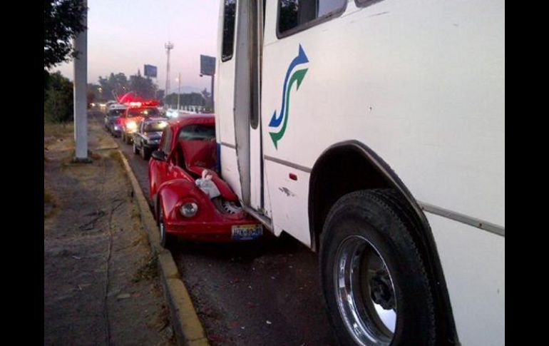 Jalisco | El percance ocurre entre un particular y una unidad de la ruta 644-A Choque sobre carretera a Chapala deja complicaciones viales La Secretaría de Vialidad reporta como lesionada a la conductora del vehículo particular e informa sobre complicaciones viales en la zona Por: EL INFORMADOR 27 de diciembre de 2011 - 08:26 hs El particular quedó bajo la parte trasera de la unidad de transporte público. Imagen publicada en Twitter por @CarL0sL0za. ESPECIAL / GUADALAJARA, JALISCO (27/DIC/2011).- Alrededor de las 7:20 de la mañana se registró un choque entre un coche particular y una unidad de la ruta 644-A sobre carretera a Chapala a la altura de El Tapatío. La Secretaría de Vialidad reporta como lesionada, únicamente, a la conductora del particular, quien resultó lesionada. A decir de la dependencia, la zona presenta complicaciones viales luego del infortunio. Temas Accidentes Vialidad Carretera Chapala SVyT Lee También Choque en la colonia Aldama Tetlán deja dos lesionados Clima en Chapala hoy: el pronóstico para el sábado 11 de octubre de 2025 Clima en Chapala hoy: el pronóstico para el viernes 10 de octubre de 2025 Festival Axixic Vive 2025: "El Lago es Nuestra Tradición" Recibe las últimas noticias en tu e-mail Todo lo que necesitas saber para comenzar tu día Registrarse implica aceptar los Términos y Condiciones
